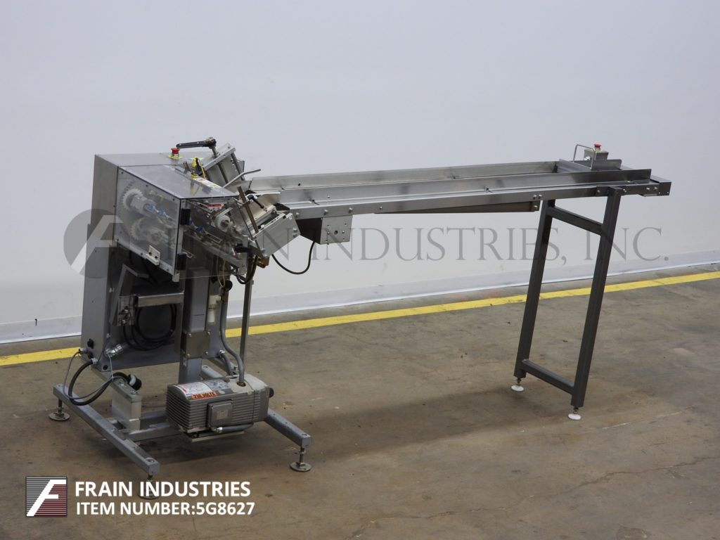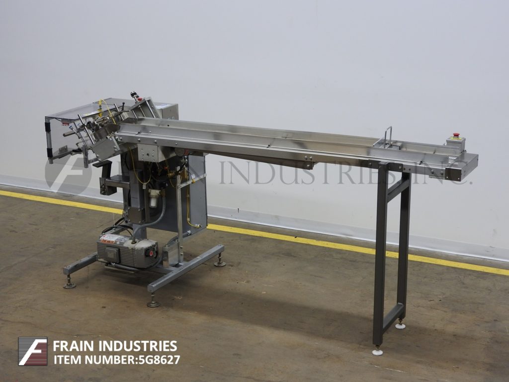 Back to All EquipmentMGS, Model RPP-421, topsert feeder. Rated from 25 to 400 picks per minute – depending on materials, application and machine configuration. Product size range: 1" to 10" in Width x 1" to 6" in Length. Equipped with a 97" long (2) belt powered product magazine, (4) head rotary pick n place, vacuum pump and drive motor. Control panel with an AB PLC.