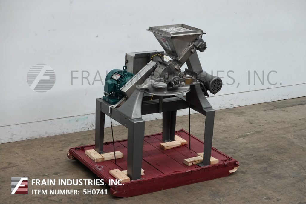 Back to All EquipmentMikro Pulverizer, Model 1SH, hammer mill with 316 stainless steel contact parts. Production rates per hour – depending on materials, application and machine configuration. Equipped with a 12" wide x 13" long x 9" deep feed hopper, 1½" diameter feed auger powered by a 1/3 HP drive and (6) 3¼" wide swinging blunt impact hammers powered by a 5 HP drive. Product discharge is 16” long x 11” wide with 36” floor clearance. Mounted on a (4) leg painted base frame with a 3" diameter port for use with a dust collector and casters. Used to grind, de-lump, pulverize and process wet / dry products.