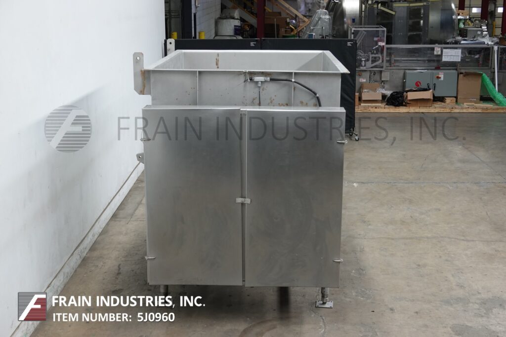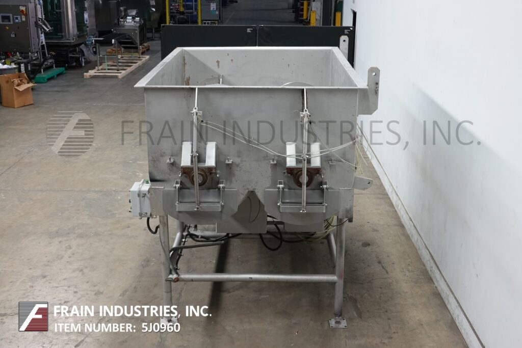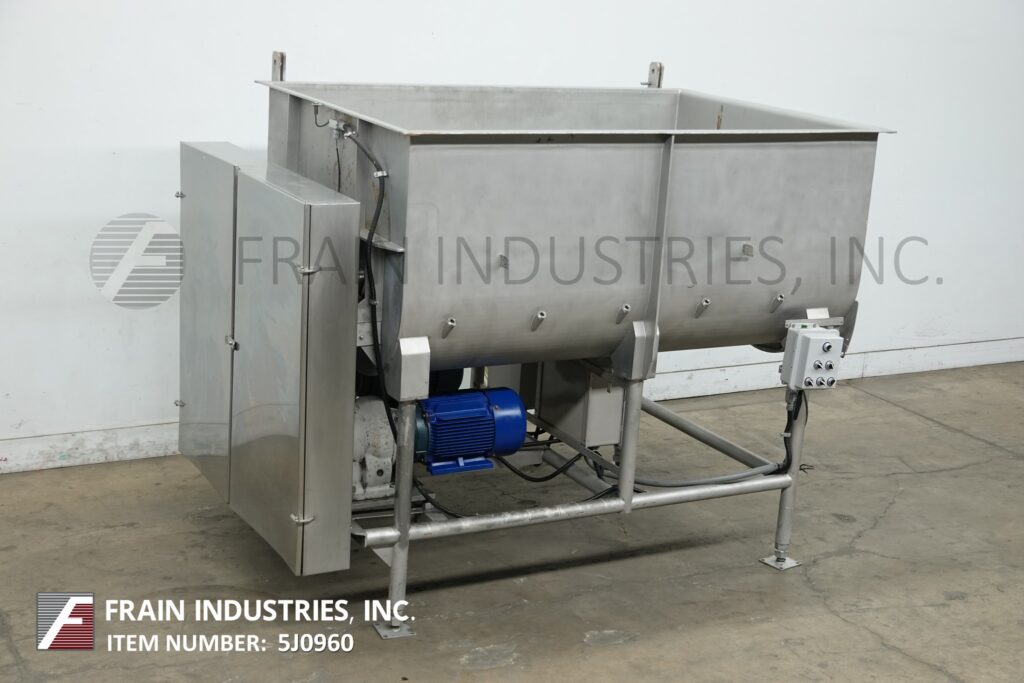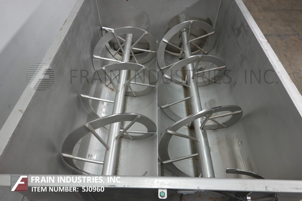 Back to All Equipment304 stainless steel, dual trough ribbon blender. Capacity: 130 ft³ total (90 ft³working). Pounds of product per hour – depending on materials and application. Dual trough with mixer dimensions of: 96" in Length; 60" in Width; 42" in Depth. Equipped with 3½" wide x ½" thick ribbons, (10) steam injection ports, dual 22" wide x 10" high pneumatic gate discharges with 38" ground clearance and powered by (2) 20 hp motor drives. Mounted on heavy duty frame.