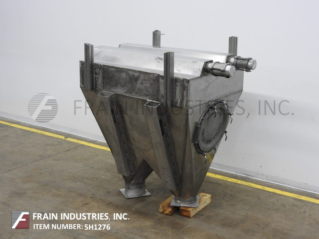 Moline Model DSM2000, continous, stainless steel, powdered, granulated or cinnamon sugar rumbler for donut coating system rated from 500 to 2000 dozen donuts per hour – depending on materials and application. Drum specifications: 24" ID; 88" in Length with 1" long x 1/2" wide inside drum perfs and flip open bolt down cover. Equipped with 36" long in feed chute and 24" ID discharge both have 36" floor clearence, and 10" OD discharge end sugar recycle chute with 63" long x 16" wide x 22" deep stainless steel reclaim suger bin with flip up cover, and inner / outer paddles as well as 4" OD stainless steel bottom feed screw to 80" long incline cleated feeder with 6" wide belt and 1-1/2" hjigh cleats on 6" centers with cover. Mounted on stainless steel base frame.
