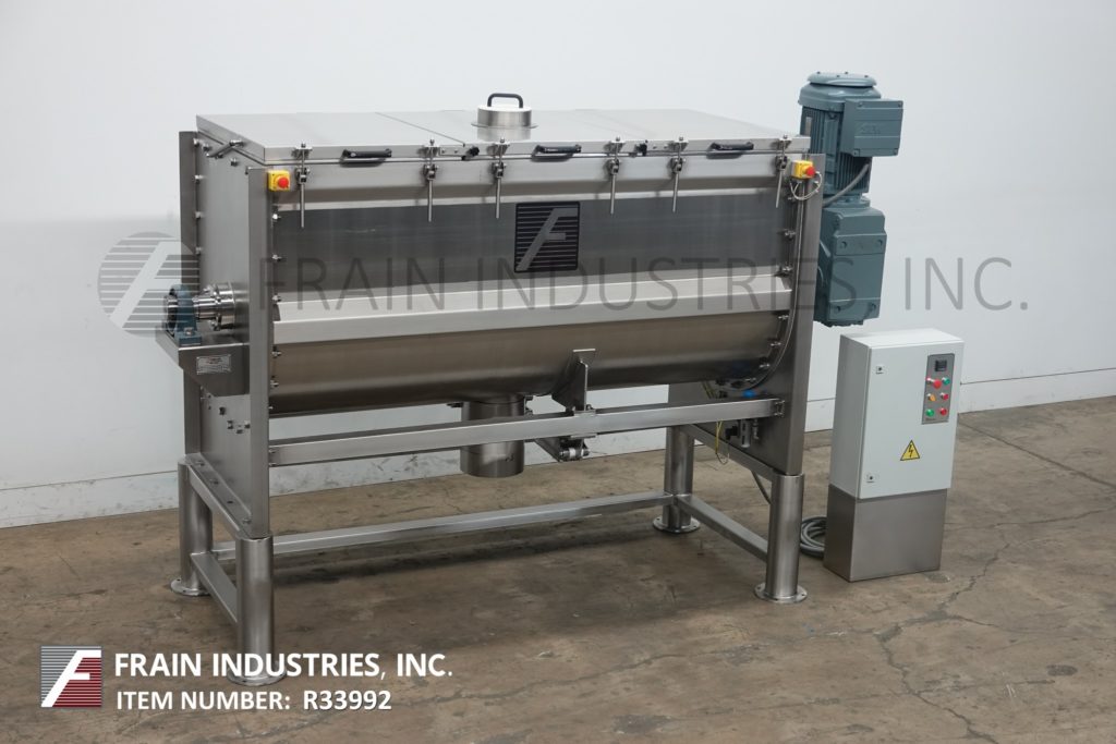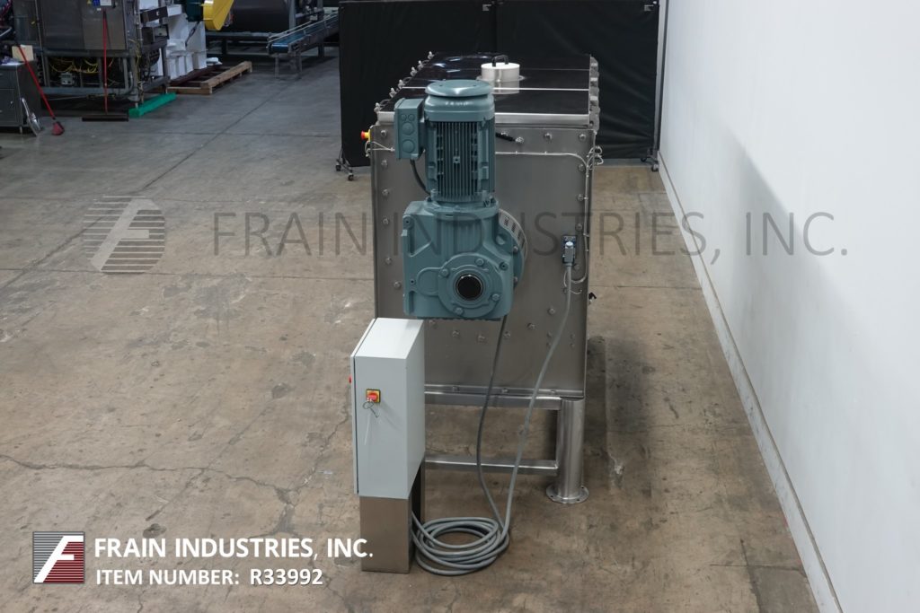 Back to All EquipmentMorcos, Model RM200, 65 ft³, (60 ft³ working capacity), double ribbon mixer with pounds of product per hour – depending on materials and application. 304 stainless steel contact parts. Inner mixing chamber dimensions of 90" in Length; 36" in Width; 40" in Depth. Equipped with flip up cover, lift out safety screens, 3½" OD motor shaft, 7" OD mixing shaft with 2¾" wide x (5/16)" thick (outer) and 2¾" wide x (5/16)" thick (inner) stainless steel ribbons. 11" OD center bottom discharge with 23" floor clearence and 20 Hp motor. Mounted on stainless steel (4) leg frame.