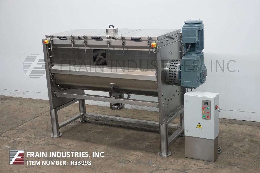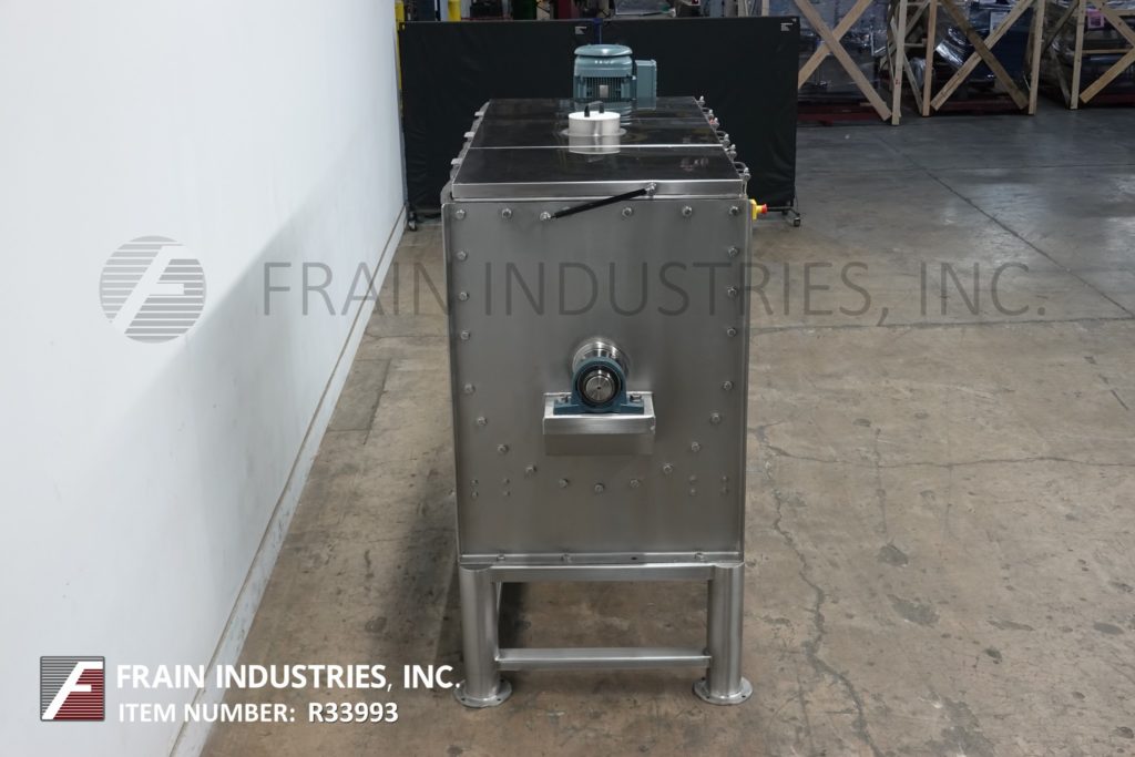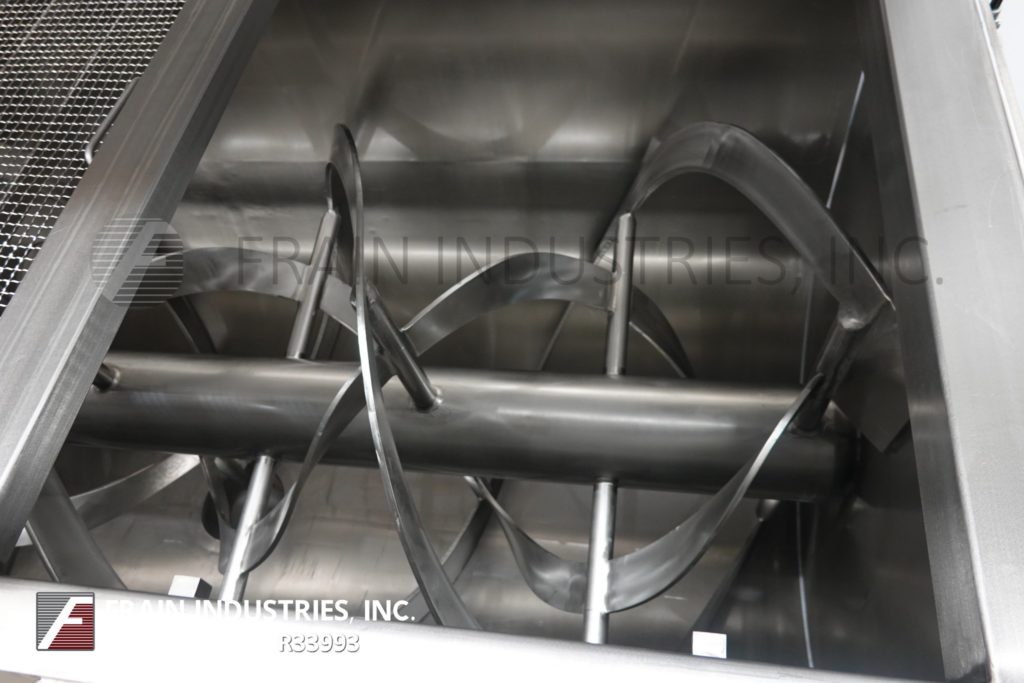Back to All EquipmentMorcos, Model RM200, 65 ft³, (60 ft³ working capacity), double ribbon mixer with pounds of product per hour – depending on materials and application. 304 stainless steel contact parts. Inner mixing chamber dimensions of 90" in Length; 36" in Width; 40" in Depth. Equipped with flip up cover, lift out safety screens, 3½" OD motor shaft, 7" OD mixing shaft with 2¾" wide x (5/16)" thick (outer) and 2¾" wide x (5/16)" thick (inner) stainless steel ribbons. 11" OD center bottom discharge with 23" floor clearence and 20 Hp motor. Mounted on stainless steel (4) leg frame.