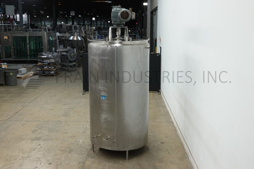Mueller, 1000 gallon capacity, 316 stainless steel jacketed process tank. Vessel dimensions: 57" ID; 97" straight wall. Equipped with lift up covers, 5 Hp top mounted side scrape / bottom sweep agitator, bottom side 3"OD / 2½"ID sanitary discharge with 10" ground clearance.