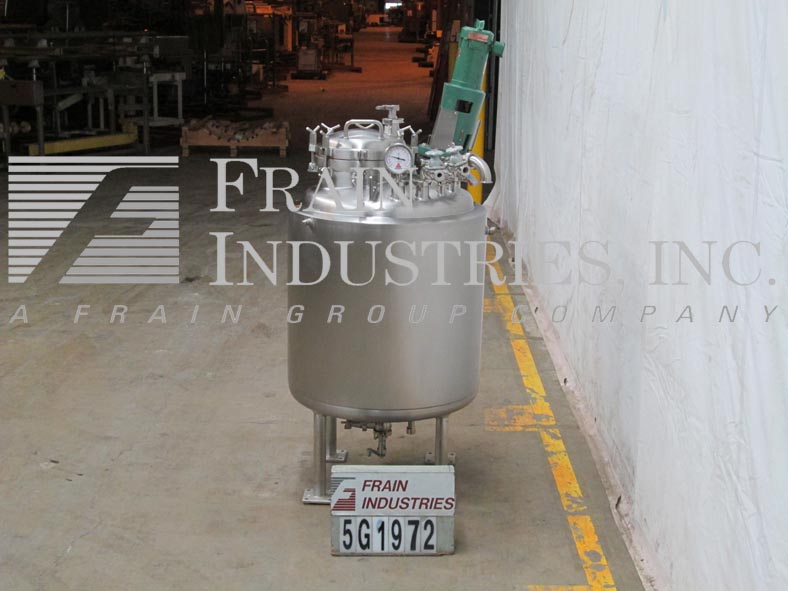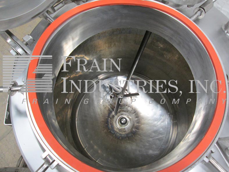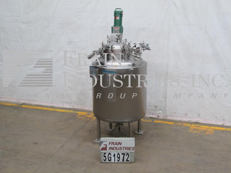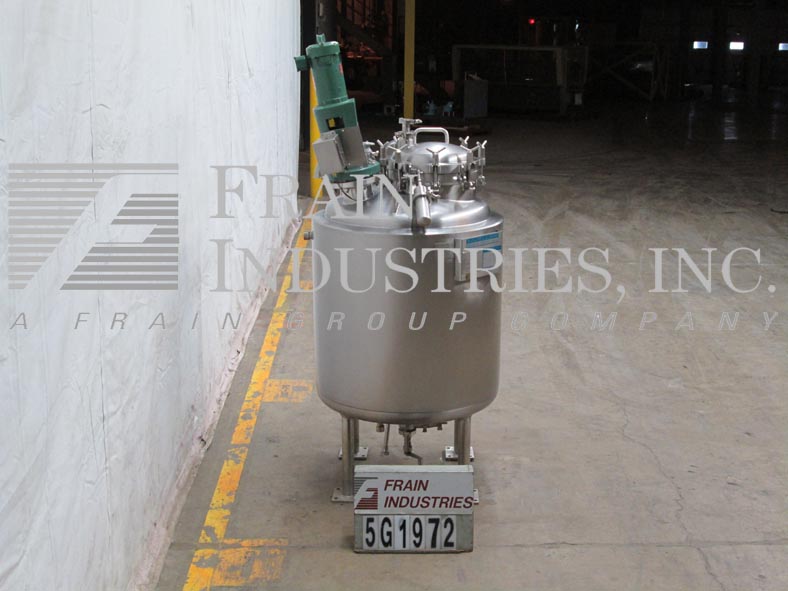 Back to All EquipmentMueller, 450 Liter, 120 gallon, 316 stainless steel, jacketed, internal pressure & vacuum rated mix vessel. Vessel dimensions: 32" ID x 36" straight wall. Equipped with dome top, 16" manway with 3" OD sanitary port, prop style agitator, (3) 2" OD and (1) 3" OD sanitary top ports. Full side and bottom jacket with 1-1/2" ID NPT in / outlets. Dish bottom has 3" OD sanitary center bottom discharge with valve with 10" floor clearance with valve (16" floor clearance without valve).