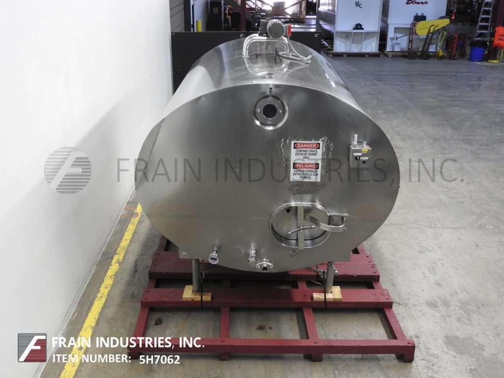 Back to All EquipmentMueller, 2,000 Gallon total capacity, 304 stainless steel, ammonia jacketed, horizontal mixing tank. Chamber dimensions: 65" height x 84" width x 114" length. Equipped with 20" OD manway with cover, top mounted prop style agitation powered by a 1 hp drive, CIP spray ball and 2½"OD / 2"ID Tri-clamp stlye side bottom outlet with 20" ground clearance.