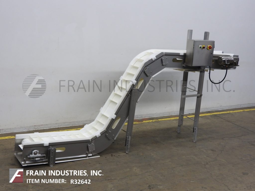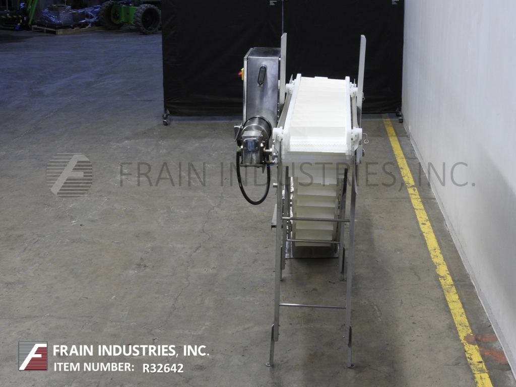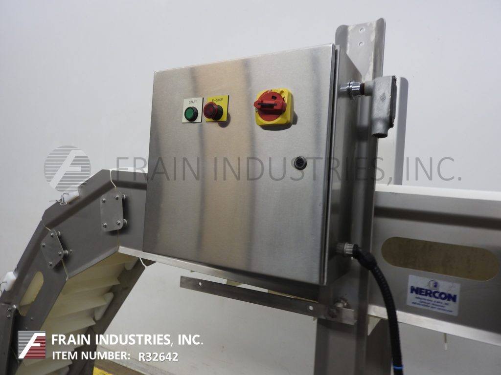 Back to All EquipmentNercon, stainless steel inclined cleated conveyor with number of product per hour – depending on materials and application. Equipped with 13" wide x 192" long belt with 2½" high cleats set on 6" centers. 48" long horizontal run has 16" to 22" in feed height. 72" long incline section and 72" long top horizontal section with 63" to 68" discharge height. Control panel with push button start and variable speed controller.