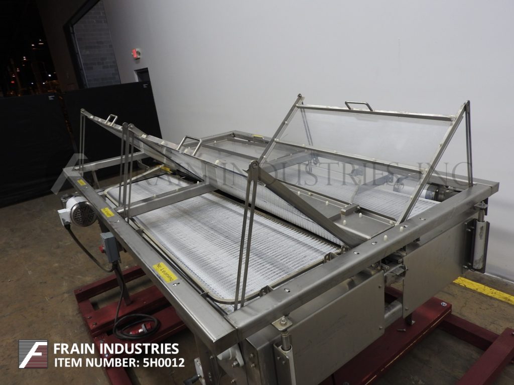 Back to All EquipmentNercon, stainless steel, bi-directional table top belt accumulation conveyor. Equipped with 4½" wide x 100" long delrin plastic product feed conveyor and (2) 24" wide x 83" long bi-directional accumulating belts which feed into the product conveyor. Mounted on a stainless steel base frame with height adjustable legs and a pneumatic height adjustable cover with a clearance range of 3" to 6" and (4) lift up access doors.