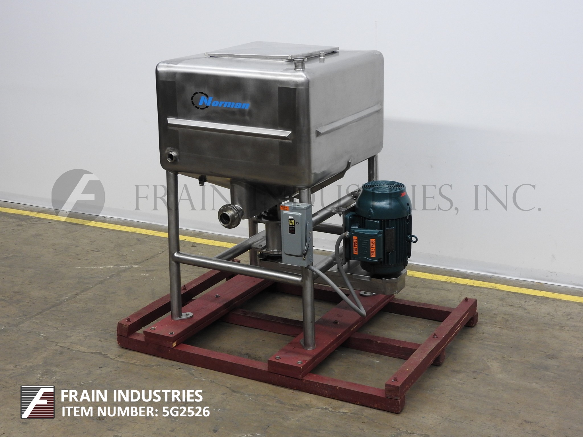 Back to All EquipmentNorman 200 gallon, 304 stainless steel, high shear, single wall, rectangular shape liquefier. Chamber dimmensions: 42" in Length; 42" in Width; 26" straight wall; 18" sloped cone bottom with 36" total depth. Equipped with 24" x 24" ID top manway and (1) 2-1/2" ID sanitary, (1) 1" ID threaded top ports. (1) 2-1/2" OD sanitary side port, and (1) 1" ID threaded bottom port. Cone bottom, 6 hole / 3 wing high shear impeller and 3-1/2" OD sanitary side bottom discharge port with 31" floor clearence, 25 Hp side mounted belt driven motor drive and mounted on (4) leg stainless steel tubular base frame.