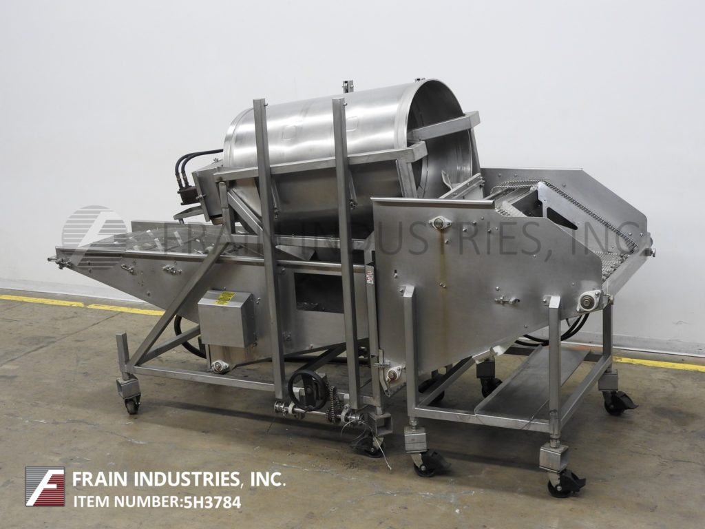 Back to All EquipmentNothum, Model FD-24, stainless steel, rotary barrel breader with number and pounds of product per hour – depending on materials and application. Equipped with a 26" wide x 45" long wire infeed belt with waterfall breadding applicator, 32" in diameter x 48" long tumbler, 26" wide x 64" long shaker discharge conveyor and 12" wide clump sifting conveyor. Complete with quick-connect hose for the supply-side hydraulic header and is setup to receive hydraulics from a plant power pac and distribute to various hydraulic motors. Mounted on stainless steel base frame.