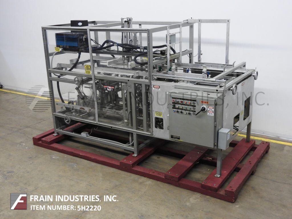 Back to All EquipmentSouthern Packaging Model TE700VFS, stainless steel, intermittent motion, tray former capable of speeds from 4 to 42 trays per minute – depending on materials and application. Minimum / Maximum tray size: 15" to 42" in Length; 12" to 38" in Width; 2" to 6" in Depth. Equipped with 37-1/2" Long x 37-1/2" Wide flat blank magazine with (4) suction cup recipcating pic-n-place and multi wheel feeding system, diving (4) corner 20" wide x 23-1/2" single air ram tray forming head, 70" Long (2) chain lugged transfer conveyor set on 25" centers Nordson (4) gun H/M glue system, with compression section. Control panel has A/B controller, with on / off, jog, run, glue, vacuum, ram head and,e-stop, controls, with interlocking safety guarding. Mounted on heavy duty base frame.