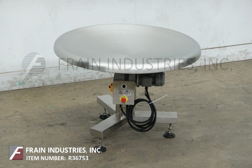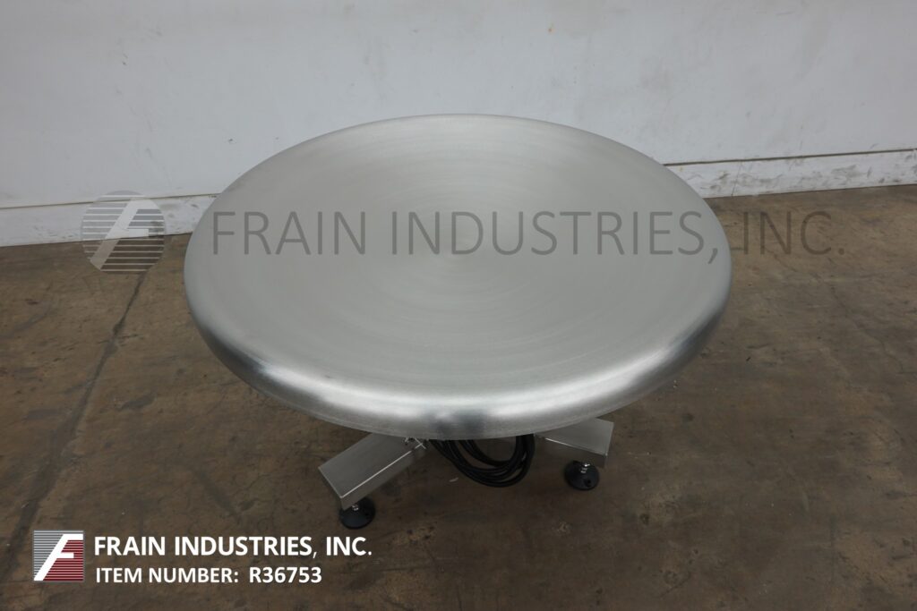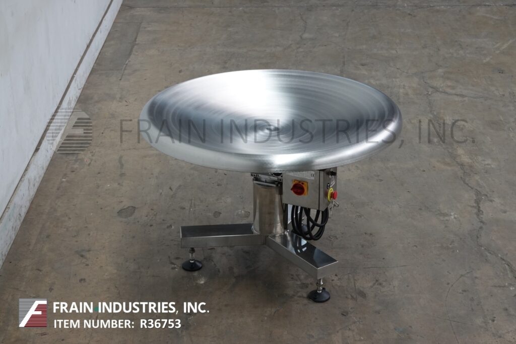 Back to All EquipmentOhlson, Model CT-47-SS, stainless steel construction, 47" diameter disc accumulation table with number of product per hour – depending on materials and application. Equipped with 47" diameter stainless steel concave disc that allows the bags to slide to center allowing for more accumulation. Control panel has variable speed contoller with e-stop. Mounted on stainless steel frame with adjustable legs and a table height of 32".