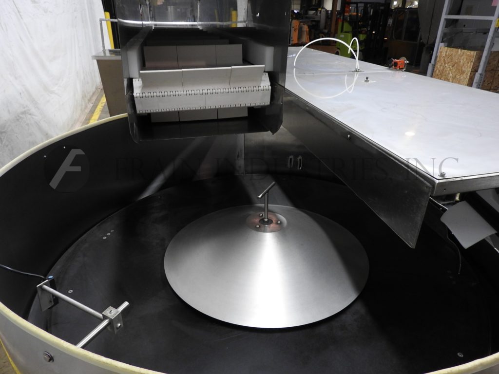 Back to All EquipmentOmega Design, Model OS5-72, stainless steel, low profile, bulk plastic bottle unscrambler. Rated from 20 to 300 containers per minute – depending on materials and application. Container size range: 1oz to 1 gallon and capable of orienting round, square, rectangular, oval, tapered and f-style containers with proper change parts. Equipped with floor level 38" long x 58" wide x 24" deep stainless steel feed hopper with 52" long vertical travel and 96" long horizontal travel x 17" wide incline cleated feeder belt with 3" high cleats on 12" centers, 60" OD sorting bowl with a non scuffing nylon face, (3) spring loaded 1¼" wide belts: 18" long transfer belt, 48" long spacing / orientation belt and 32" long discharge belts. Control panel has variable speed dials, start and e-stop push button controls. Mounted on stainless steel base frame with lexan safety guarding.