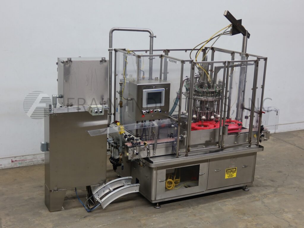 Back to All EquipmentPacific Packaging, 12 head, stainless steel, rotary, volumetric filler with number of containers per minute – depending on materials, application and machine configuration. Equipped with 4½" wide container conveyor with worm screw to star wheel in feed and discharge, 19" long x 10" wide x 18" deep product hopper, Waukesha Model 30 PD pump and has (12) ¼" ID positive cut off fill nozzles capable of doing both light and semi-viscous product. Control panel with A/B PLC controller and touch screen HMI controls. Mounted on heavy duty stainless steel frame with safety door guarding.