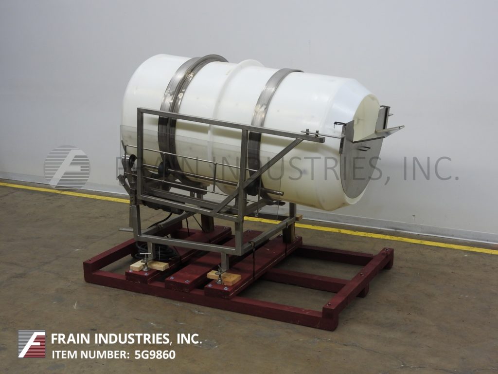 Back to All Equipment40" diameter, continuous motion, plastic coating drum with pounds of product per hour – depending on materials, application and machine configuration. Equipped with an adjustable angle 40" diameter x 78" long coating drum with (8) 2½" wide fixed interior soft flight baffles, 39" diameter in feed and 24" diameter discharge with 28" in feed and 22" discharge height. Mounted on stainless steel (4) leg base frame with casters.