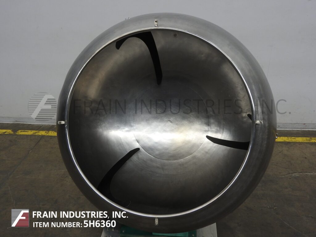 Back to All Equipment46" diameter, stainless steel, sphere shaped, coating pan. Pan dimensions: 46" inner diameter; 32" in depth. Equipped with a 32" diameter access opening with bolt down cover, (3) interior baffles and 43" charge height.