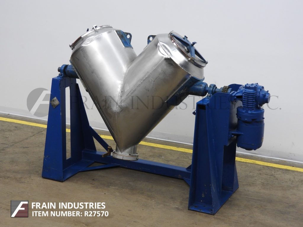 Back to All EquipmentPatterson Kelly Model 10 ft³, 304 stainless steel, twin shell mixer. Rated to 135 lbs per ft³ and Ibs per hour – depending on materials, application and machine configuration. Equipped with (2) 17½" ID product ports with bolt down covers, (2) 44" long side V-Walls and (2) 15" long inner V-Walls. 8"ID butterly valve discharge with 12" ground clearance and powered by 3 Hp drive. Requires 78" ceiling clearance with 33" swing radius / 66" swing diameter. Mounted on painted base frame.