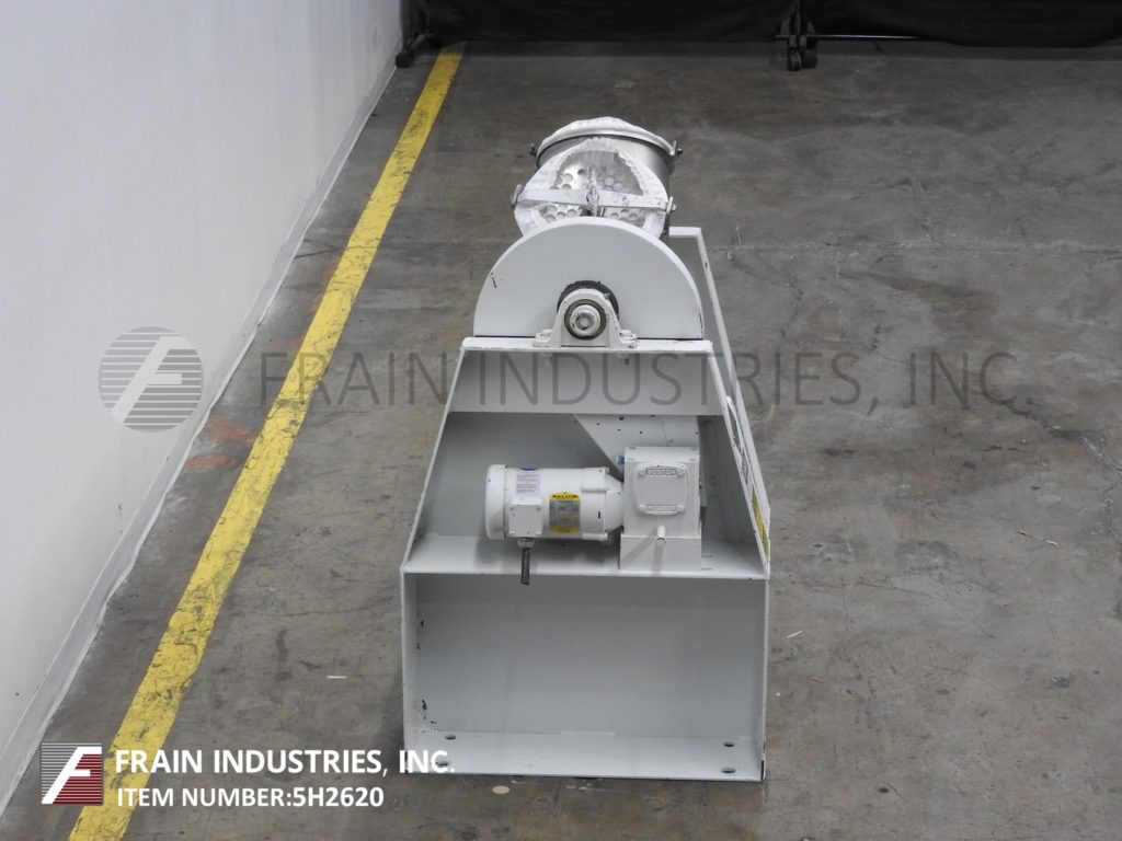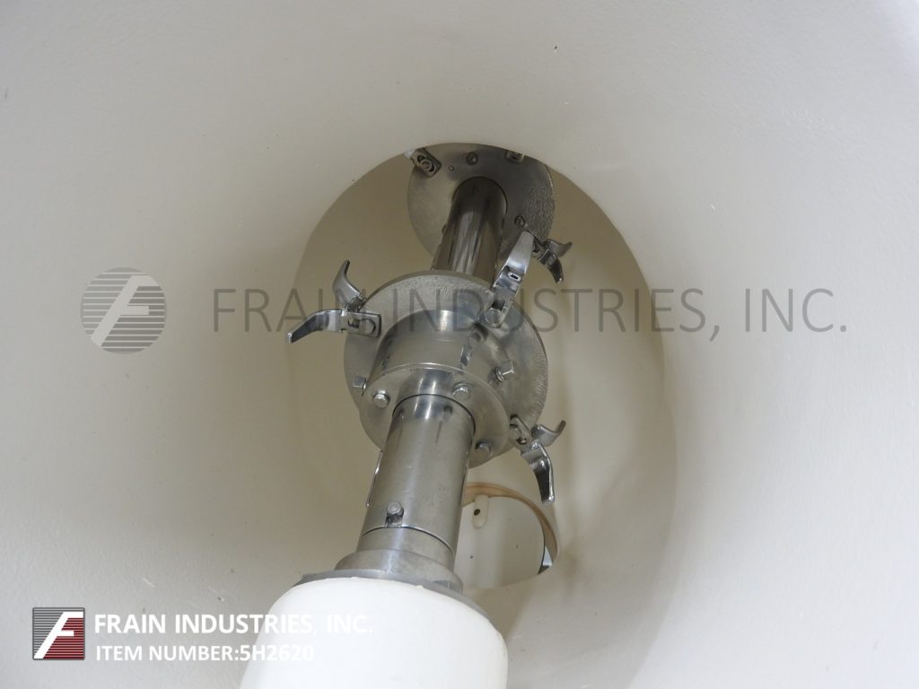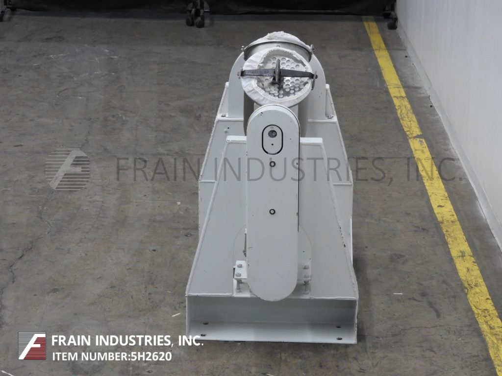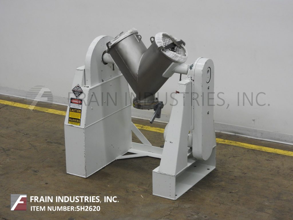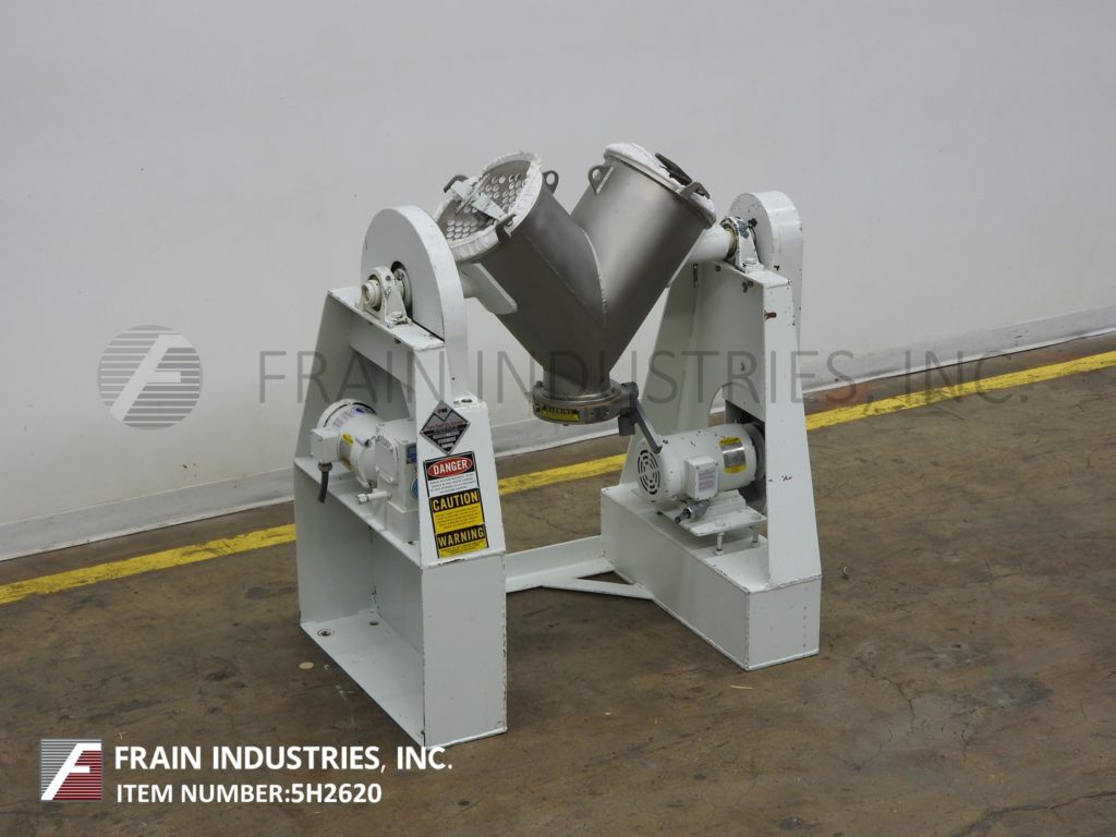 Back to All EquipmentPatterson Kelly, 1 ft³, Kynar (PVDF) coated, twin shell mixer. Rated to 60 lbs per ft³ with Ibs per hour – depending on materials and application. Equipped with (2) 11½" ID product ports with bolt down covers, (2) 16" long side V-Walls and (2) 7" long inner V-Walls. 6"ID butterly valve discharge with 24" ground clearance. Shell powered by ¾ Hp drive and dog ear style intensifier bar powered by 2 Hp drive. Requires 56" ceiling clearance with 17" swing radius / 34" swing diameter. Control panel has push buttons start / stop and timer dial. Mounted on painted base frame.
