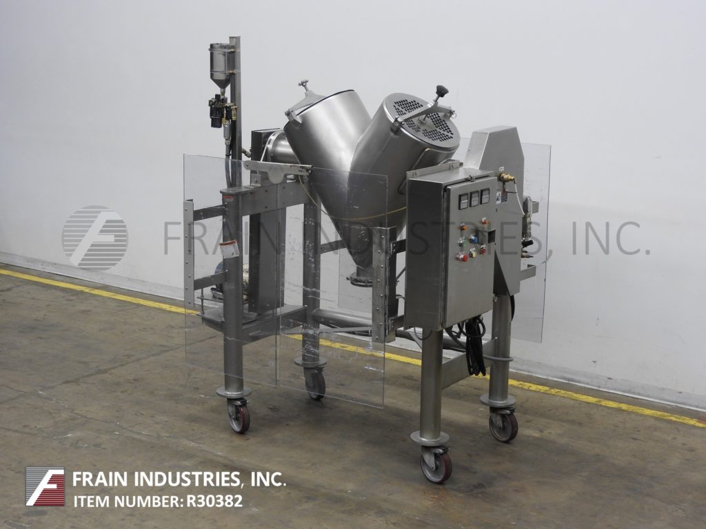 Back to All EquipmentPatterson Kelly, 5 ft³, 316 stainless steel, twin shell mixer. Rated to 70 lbs/ft³ with Ibs of product per hour – depending on materials and application. Equipped with (2) 18" ID product ports with bolt down covers, (2) 34" long side V-Walls and (2) 10" long inner V-Walls, liquid solids bar and 6"ID butterly valve discharge with 36" ground clearance. Requires 96" ceiling clearance with 30" swing radius / 60" swing diameter. Has push button start / stop controls and digital timers. Mounted on (4) stainless steel frame with casters and safety guarding.