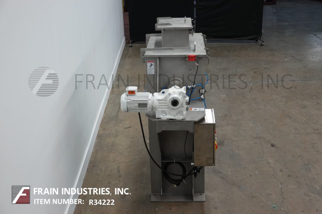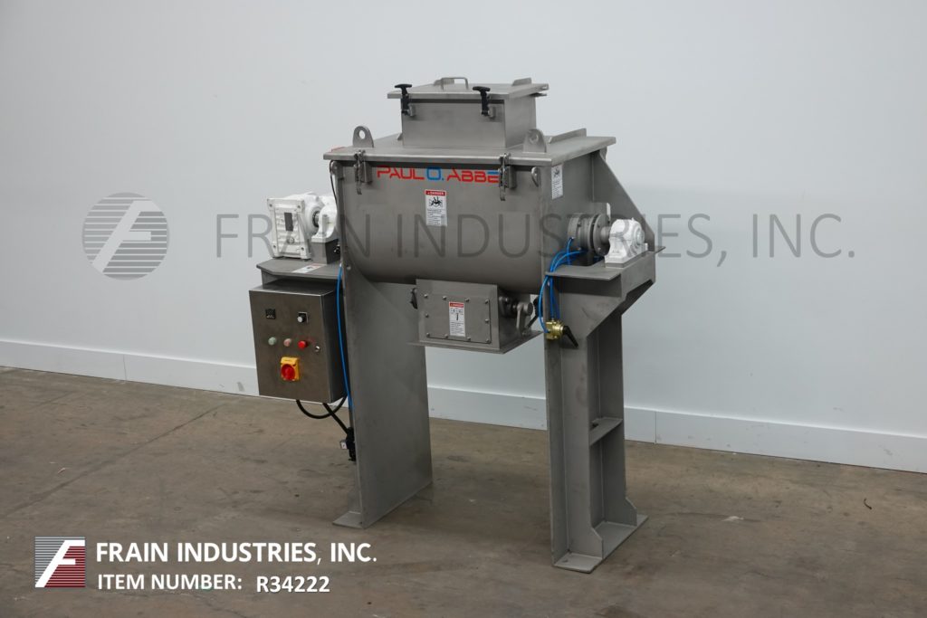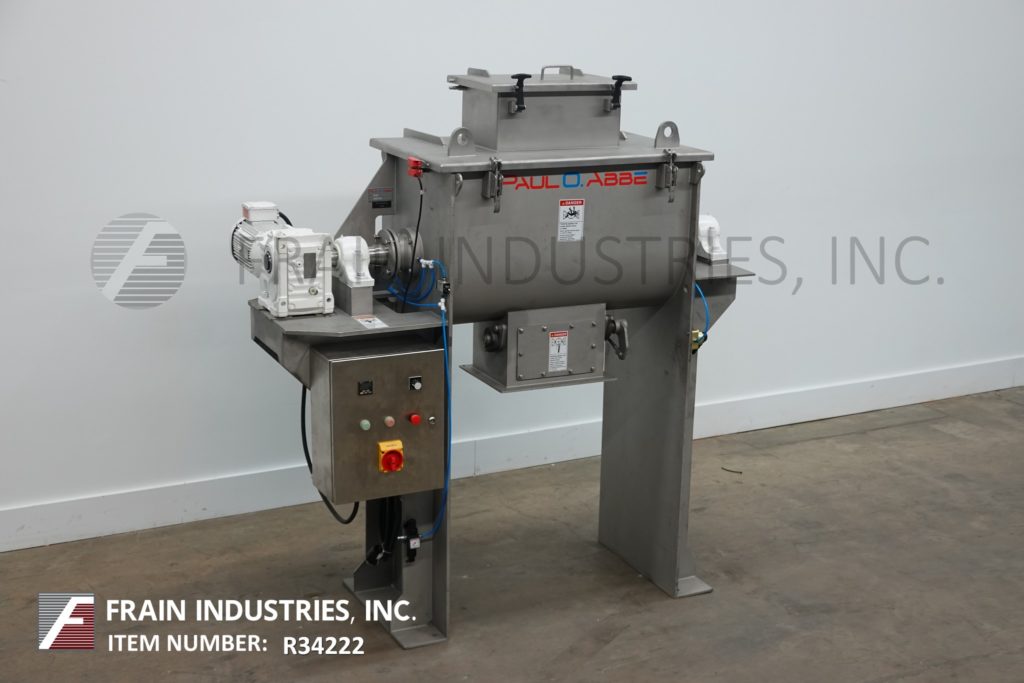 Back to All EquipmentPaul O Abbe, Model RB-10, 10 ft³, double ribbon mixer with amount of product per hour – depending on materials and application. 304 stainless steel contact parts. Inner mixing chamber dimensions of: 39" in Length; 22" in Width; 25" in Depth. Equipped with top mounted product feed hopper with safety grate and flip up / clamp down interlock safety cover and 1½" wide x (3/8)" thick (outer) and 2" wide x ¼" thick (inner) stainless steel ribbons double ribbons powered by 5 Hp drive. Bottom pneumatic flap valve discharge has 16" x 12" flanged bottom with 35" ground clearence. Controls have valve open / close switch and variable speed control and e-stop. Mounted on heavy duty frame.