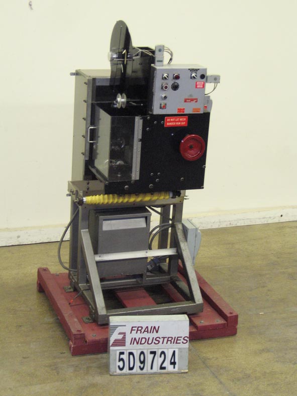 Back to All EquipmentPDC Model 75M, automatic, tamper evident, neck bander / sleever rated from 50 to 300 containers per minute – depending on materials and application. Bands: 3/8" to 3" in diameter by 3/4" to 2" in height. Equipped with worm screw in-feed, knife film cut-off, barrier guarding, auditory alarm and E-stop.