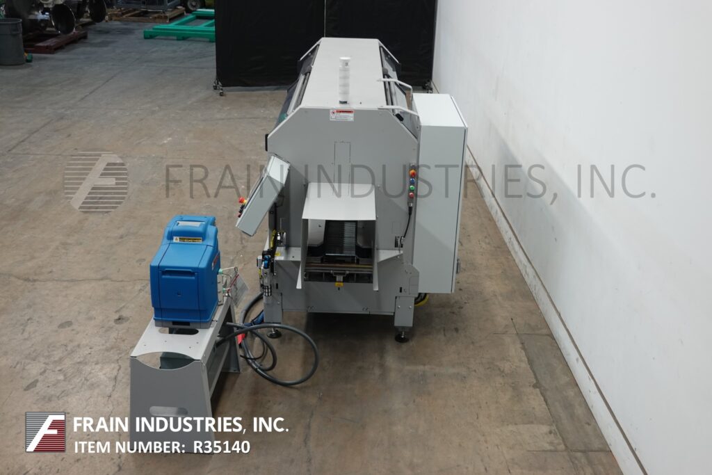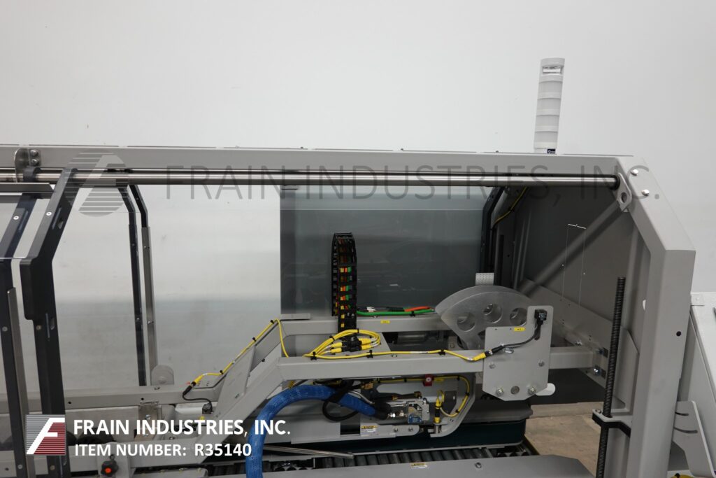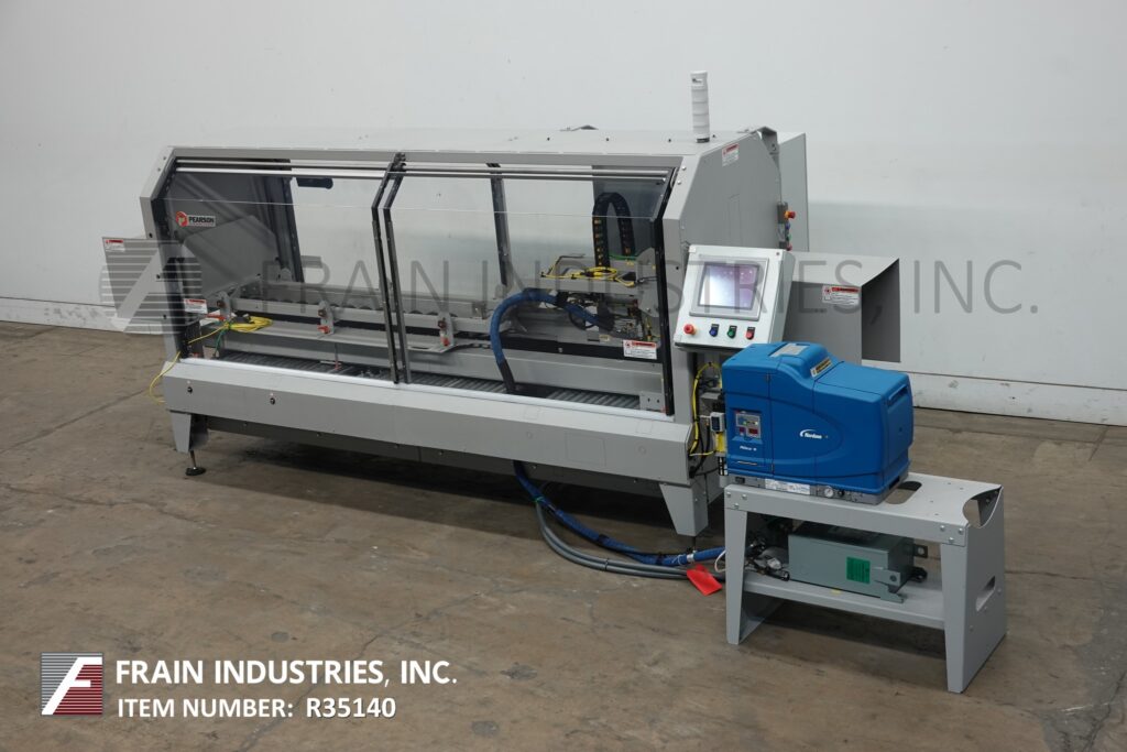 Back to All EquipmentPearson Model CS40-G, Automatic, inline, right to left top case flap closer and hot melt glue sealer. with number of cases per minute – depending materials, application and machine configuration. Case size range: 8" to 24" in Length; 5" to 16" in Width; 4.5" to 18.5" in Height and capable of handling CSSC, FOL and RSC cases. Equipped with top flap closer and side flap closing rails, 112" long side belt case assist, Nordson Pro Blue hot melt glue top case sealer with top roller glue compression discharge section. Control panel has Allen Bradley PLC controller with Allen Bradley panelview controls and e-stop. Mounted on heavy duty frame with interlock safety guarding and statis light bar.