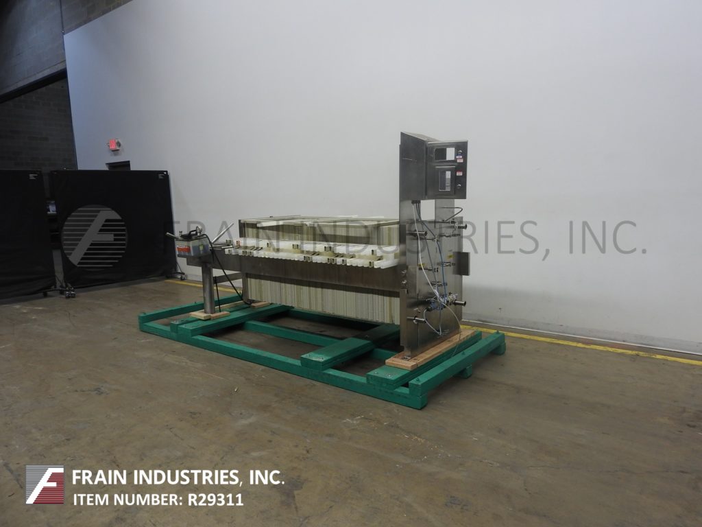 Back to All EquipmentPerrin / Evoqua Water Technologies, horizontal, stainless steel, side bar plate and frame filter press. Volumes of product per hour – depending on materials, application and machine configuration. Equipped with (31) 24" x 24" x 1" square cake plates with cake capacity of 10 ft³ and (32) 24" x 24" filtering plates with a filteration area of 128 ft², (4) 2"OD / 1½"ID Tri-clamp inlet / outlets, hand crank filter closure and air over oil hydraulic finishing closure, Rosemont digital flow meter and Precision digital turbidity meter. Mounted on (4) leg base frame.