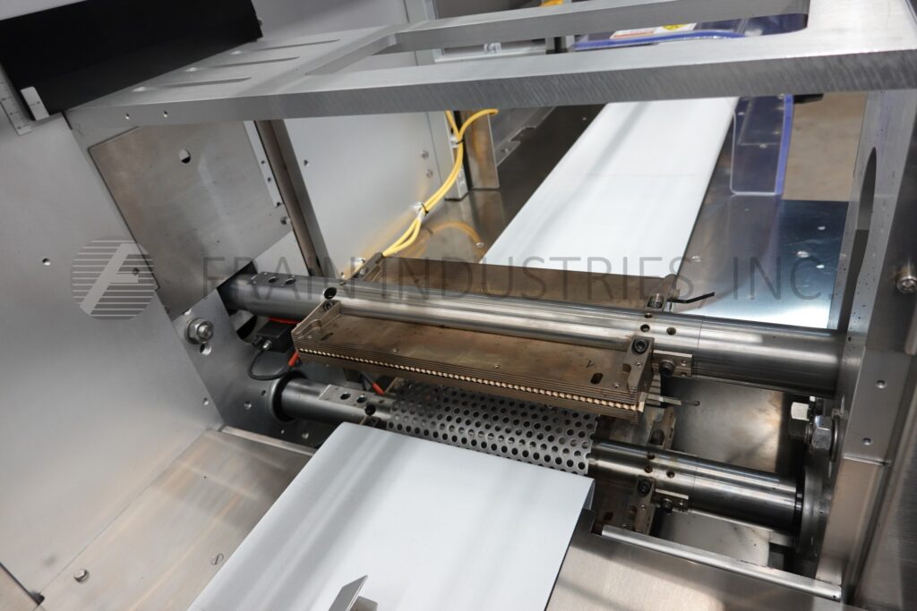 Back to All EquipmentPfm Model Falcon BB, Automatic, inverted, 2-up, (3) axis, servo driven, horizontal inverted flow wrapper rated from 50 to 200 products per minute – depending on materials, application and machine configuration. Product size range: 1.6" to 10" in Length x; 3/8" to 9" in Width; up to 3.9" in Height standard. Equipped with 114" long x 13¾" wide belt in feed conveyor and 92" long load area, no product / no pouch, with adjustable forming box, 2-up, 9.8" wide x 1-1/4" thick seal jaws and (3) sets of fin seal wheels, 1st set to pull the wrapping material, 2nd set to produce the longitudinal seal, 3rd set to fold the wrapping material has interlock safety, Film specifications up to 23.6" reel width; up to 13.7" reel OD; on 3" OD core. Has (2) film rolls (1) for extra film roll no splice station and 36" long powered discharge conveyor. Control panel has PLC controls with touch pad controller and readout, crimper jaws and fin seal temperature controllers, power, heaters and run, jog on / off switches start, stop and e-stop push button controls and statis light. Mounted on stainless steel frame with leveling legs.