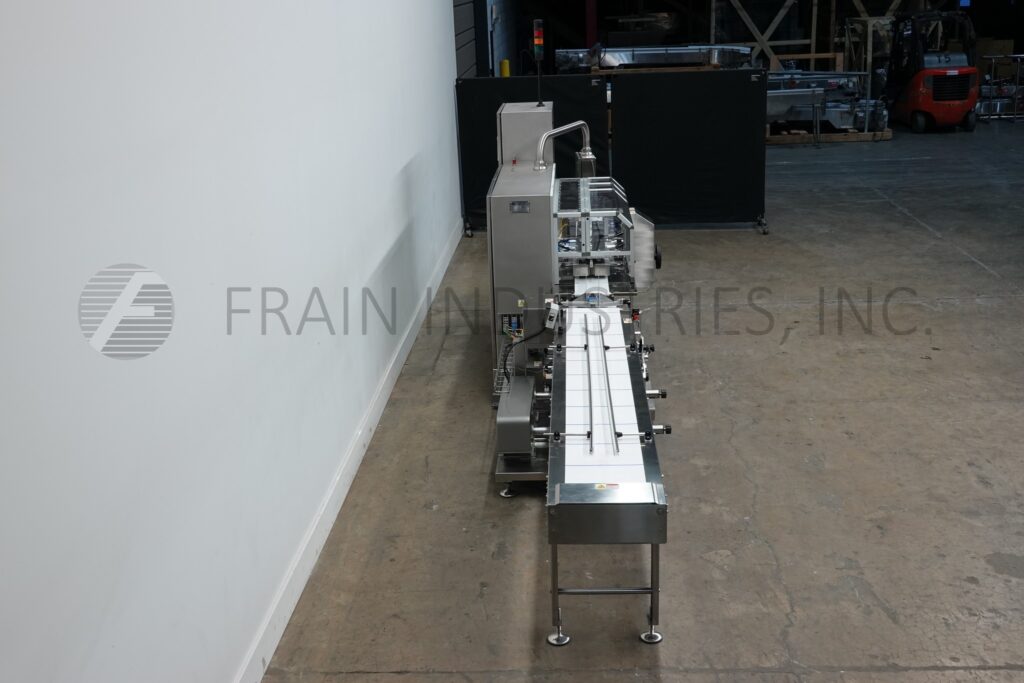 Back to All EquipmentPfm Model Falcon BB, Automatic, inverted, 2-up, (3) axis, servo driven, horizontal inverted flow wrapper rated from 50 to 200 products per minute – depending on materials, application and machine configuration. Product size range: 1.6" to 10" in Length x; 3/8" to 9" in Width; up to 3.9" in Height standard. Equipped with 114" long x 13¾" wide belt in feed conveyor and 92" long load area, no product / no pouch, with adjustable forming box, 2-up, 9.8" wide x 1-1/4" thick seal jaws and (3) sets of fin seal wheels, 1st set to pull the wrapping material, 2nd set to produce the longitudinal seal, 3rd set to fold the wrapping material has interlock safety, Film specifications up to 23.6" reel width; up to 13.7" reel OD; on 3" OD core. Has (2) film rolls (1) for extra film roll no splice station and 36" long powered discharge conveyor. Control panel has PLC controls with touch pad controller and readout, crimper jaws and fin seal temperature controllers, power, heaters and run, jog on / off switches start, stop and e-stop push button controls and statis light. Mounted on stainless steel frame with leveling legs.