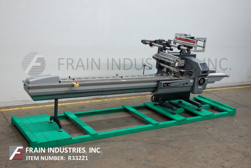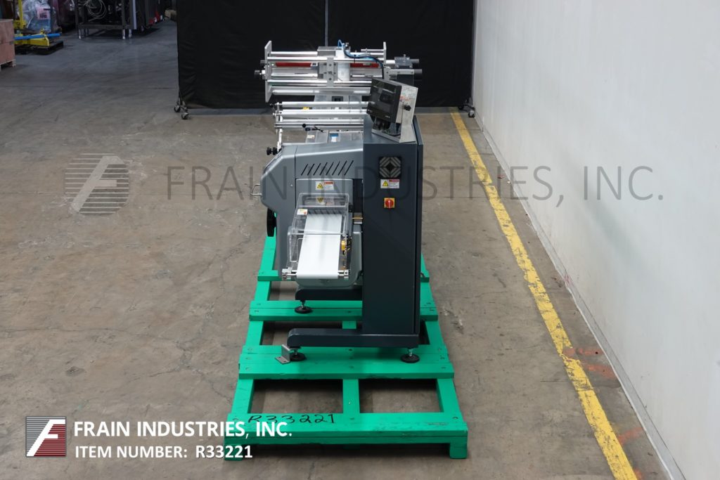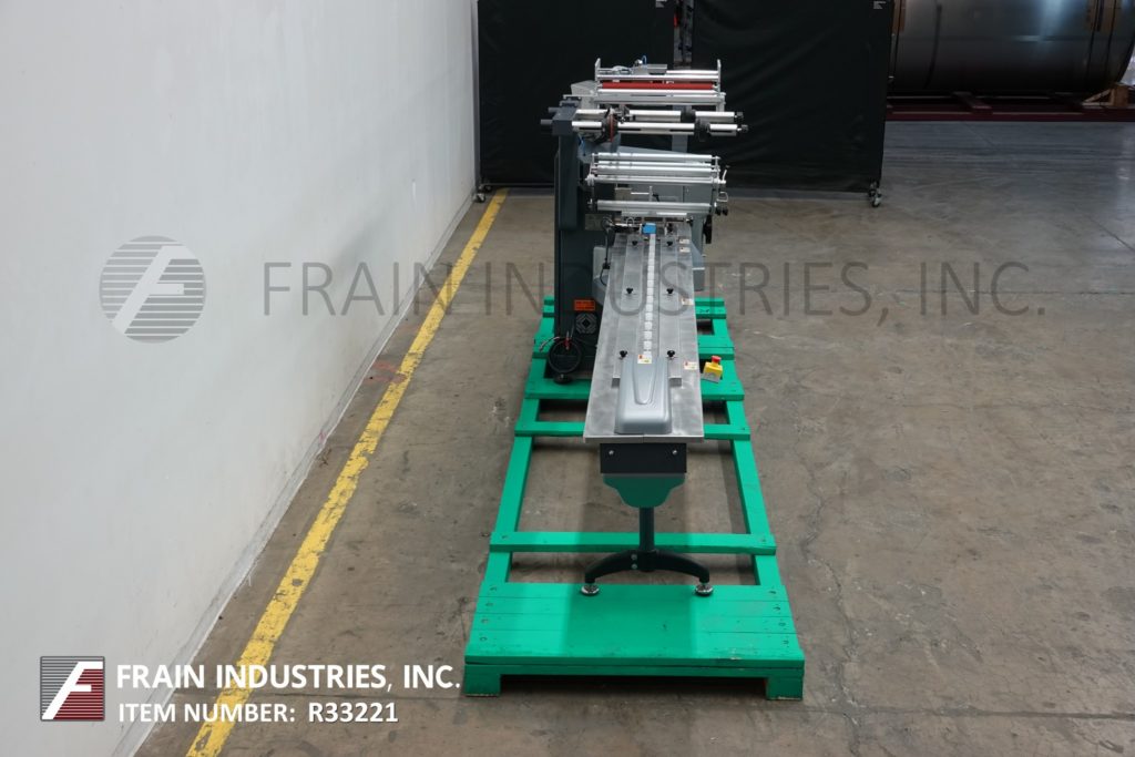 Back to All EquipmentPfm Model Pearl, 2-up, automatic, 3 axis, servo driven, horizontal wrapper rated from 30 to 150 products per minute – depending on materials, application and machine configuration. Product size range: 1.6" to 18" in Length; 3/8" to 8.5" in Width; up to 3.9" in Height. Equipped with 80" long operator load area, lugged chain infeed, adjustable former, 2-up, 8.6" wide x 1" thick serrated seal jaws and fin seal assembly wheels with Interlock safety guarding and 42" long x 8" wide neophreme product discharge conveyor. Film spec’s up to 24" reel width; 14" OD reel, on 3" OD core. Control panel has PLC controls and touch pad controller with start, stop and e-stop push buttons. Mounted on base frame with (6) leveling legs.