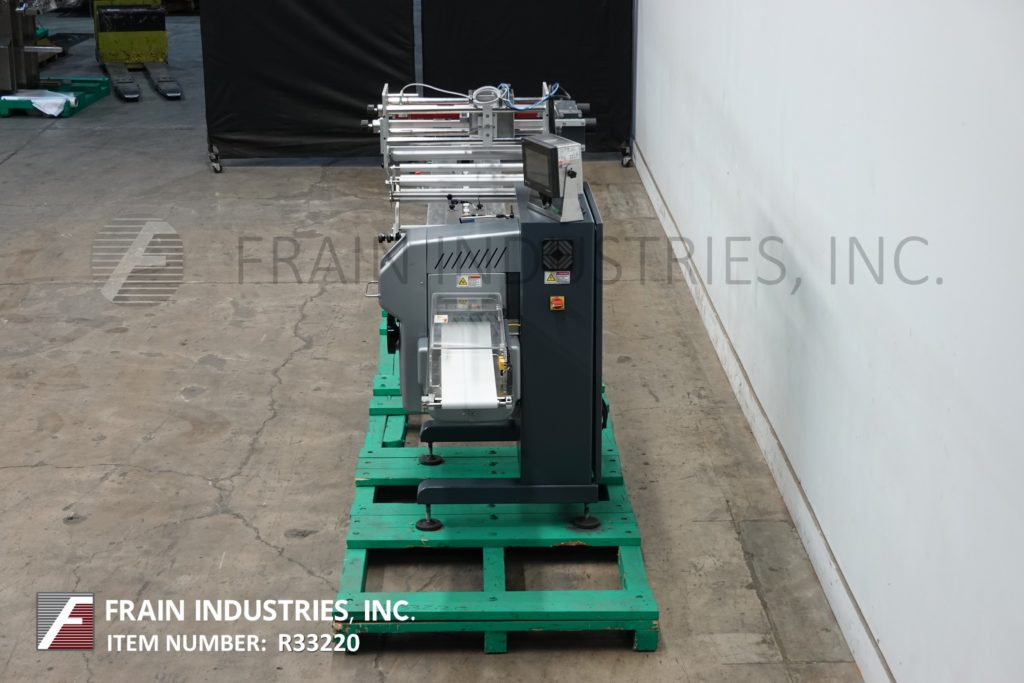 Back to All EquipmentPfm Model Pearl, 2-up, automatic, 3 axis, servo driven, horizontal wrapper. Product size range: 1.6" to 18" in Length; 3/8" to 8.5" in Width; up to 3.9" in Height. Equipped with 60" long operator load area, with 1-1/2" high lugs, adjustable former, 2-up, 8.6" wide cross seal jaws and Interlock safety guarding. Film up to 24" in width; 14" diameter; on 3" OD core. PLC with touch pad and e-stop. Speed dependent on materials, application and machine configuration.