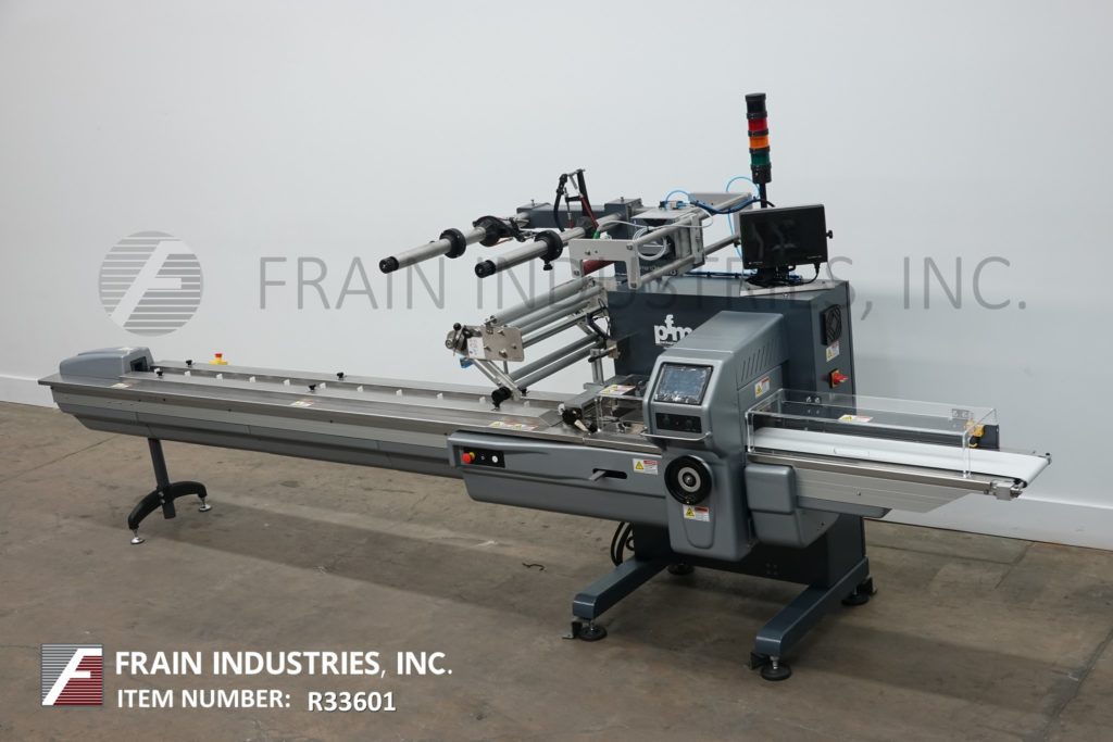 Back to All EquipmentPfm Model Pearl, 2-up, automatic, 3 axis, servo driven, horizontal wrapper. Product size range: 1.6" to 18" in Length; 3/8" to 8.5" in Width; up to 3.9" in Height. Equipped with 60" long operator load area, with 1-1/2" high quick change lugs, adjustable former, 2-up, 8.6" wide x 1" thick serrated seal jaws and fin seal assembly wheels with Interlock safety guarding and 42" long x 8" wide neoprene product discharge conveyor. Film spec’s up to 24" reel width; 14" OD reel, on 3" OD core. Control panel has PLC controls and touch pad controller with start, stop and e-stop push buttons. Speed dependent on materials, Application and machine configuration. Mounted on base frame with (6) leveling legs.