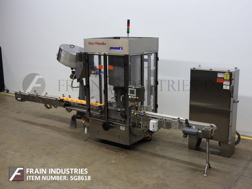 Back to All EquipmentPneumatic Scale, Model A-Frame, automatic, 8 head rotary chuck capper. Rated from 50 to 240 containers per minute – depending on materials, application and machine configuration. Cap size: up to 89mm. Container Size: up to 6" in Diameter with proper change parts. Equipped with 237" long x 5" wide container conveyor with 54" long worm screw to star wheel container indexing, cap hopper, 36" diameter disc cap sorter, feed chute, cap pick off, no container / no cap, 32" OD rotary turret and (8) friction chucks set on 6¼" centers. Controller has start, stop, e-stop push buttons with touch screen display. Mounted on heavy duty base frame.