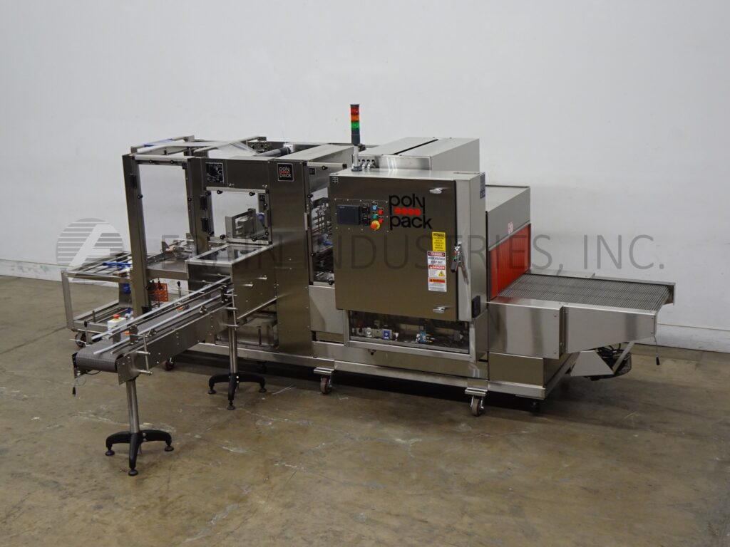 Back to All EquipmentPolyPack, Model PH 24, automatic, intermittent motion, stainless steel, shrink bundler and heat tunnel. Rated from 5 to 25 bundles per minute – depending on materials and application. Maximum bundle size: 18" in Length; 10" in Height; 20" in Width. Equipped with 12" wide x 77" long right angle product in feed conveyor with pneumatic pusher assembly, 24" wide Teflon coated hot knife seal bar, top hold down and easy access dual film roll carriage with 24" wide,14" OD and 2 ML maximum clear polyethylene film on 3" core. Single zone shrink tunnel with 14" High x 27" wide aperture x 40" Long heat chamber and product conveyor running thru tunnel. Control panel with touch screen HMI and statis light bar. Mounted on heavy duty stainless steel frame with casters and leveling legs.