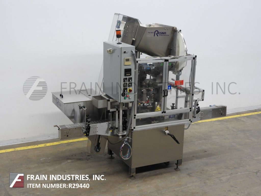 Back to All EquipmentResina, Model NRS30, automatic, single head stainless steel capper. Rated from 20 to 60 containers per minute – depending on materials, application and machine configuration. Cap size range: 13mm to 120mm. Container size range: up to 6" OD x up to 13" in Height (proper change parts required for different size ranges). Equipped with cap feeder with H-26 vertical pin dial hopper and sorter with 72" long x 4½" wide stainless steel container conveyor, cap chute, transfer shoe and double side belt container grippers, single chuck style capping head and safety guarding. Control panel has conveyor, hopper, capper speed control dials with start / stop push button controls and statis light bar. Mounted on (4) stainless steel base frame.