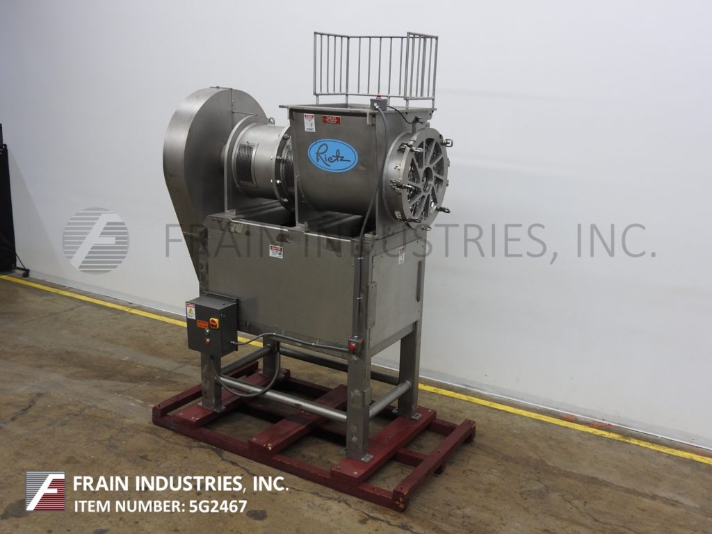 Back to All EquipmentRietz Model RE24K7E333, stainless steel extructor, designed for grinding frozen, partially frozen, or fully thawed 40 lb pound blocks of product and is rated from 40 to 30,000 lbs per hour – depending on materials and application. Equipped with 30" long x 27" wide x 34" ID stainless steel crevice free product hopper with (6) 10" long x 7" high hammer blades on 8" OD shaft and (6) 5" long x 8 high stationary anvils (no knives / no sharpening, low maintenance), 24" ID rotary product reduction port, with swing open, bolt down cover, reduction screen (change part per application). Chain to sprocket with 30 Hp motor drive with safety guarding. Mounted on (4) leg base frame.