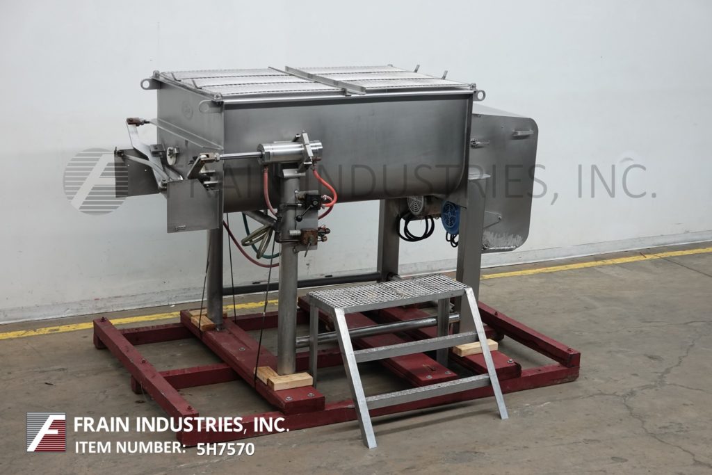 Back to All EquipmentReitz, Model RS-18K5405, Stainless steel 28 ft³ total / 20 ft³ working capacity, twin ribbon mixer with pounds of product per hour – depending on materials and application. Mixing chamber inner dimmensions; 60" in Length; 36" in Width; 25" in Depth total, with dual flip safety grates. Equipped with dual mixing troughs and mixing ribbons set on 4" OD shafts with 2" wide x ½" thick ribbons, dual 5 Hp motor drives with safety guarding and dual air operated end bottom product discharge doors with 36" floor clearance. Mounted on (4) leg base frame.