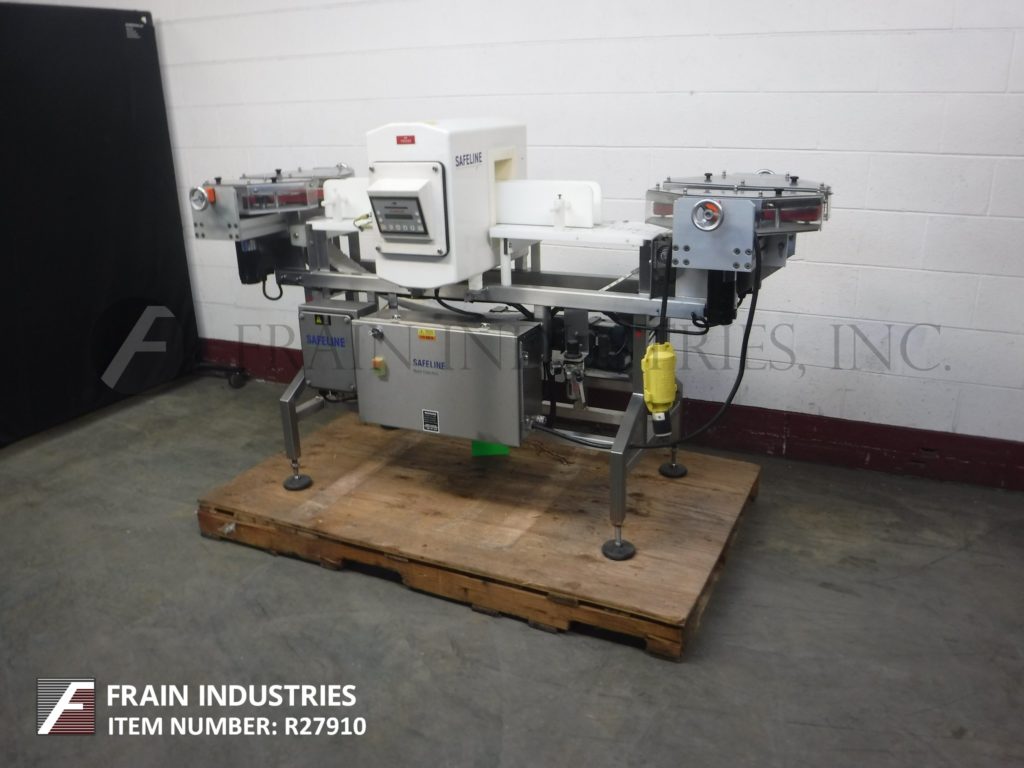 Back to All EquipmentSafeline, Model STD, automatic metal detector. with number of product per minute – depending on materials and application. Working Aperture: 7½" in Height; 5" in Width. Equipped with a 12" long x 1" wide dual side belt transfer infeed conveyor, Model SL2000 52" long x 4" wide Intralox conveyor, system with stop belt reject, 12" long x 1" wide dual side belt transfer discharge conveyor. Sensitivities: depending on product, container and enviorment being run in. Touch pad operator interface with visual display. Mounted on stainless steel frame with leveling pads.