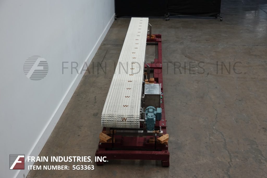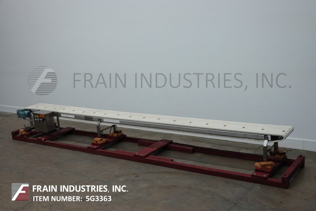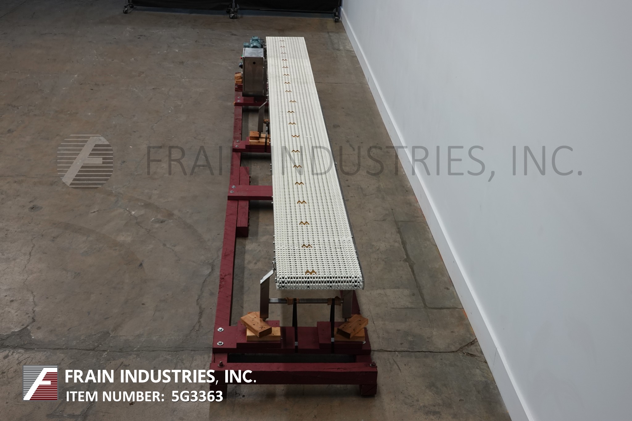 Back to All EquipmentSpan Tech, 18" wide x 240" long, stainless steel, flexlink belt conveyor. Equipped with a 1/2 hp drive and start stop controls. Mounted on stainless steel frame with height adjustable legs.
