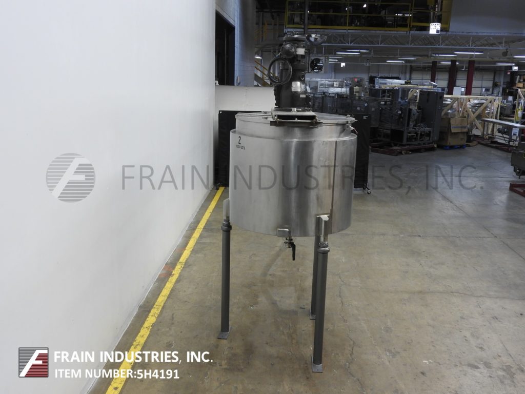Back to All EquipmentStricklin, 180 gallon, 304 stainless steel, jacketed and insulated, internal vacuum tank. Vessel dimensions: 47" diameter x 42" deep with a 36" straight wall. Equipped with flip up covers, bridge mounted sweep agitation and 3"OD / 2½"ID Tri-Clamp style discharge with 41" ground clearance. Mounted on (3) tubular legs.