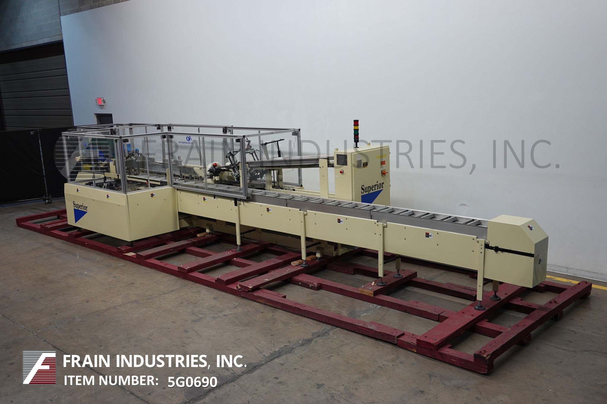Back to All EquipmentSuperior Model 200, Automatic, continuous motion, horizontal glue cartoner. Carton size range: 1.5" to 10" in Length; 3/4" to 7" in Width; 6" to 12" in Depth. Equipped with (4) chains adjustable set on 12" centers, 4" high lugs, 72" powered carton magazine, two head rotary pic n place, 144" long product load area, overhead product confiner and barrel cam loader. Allen Bradley PLC, E-stop and interlock guarding. Speed dependent on materials, application and machine configuration.
