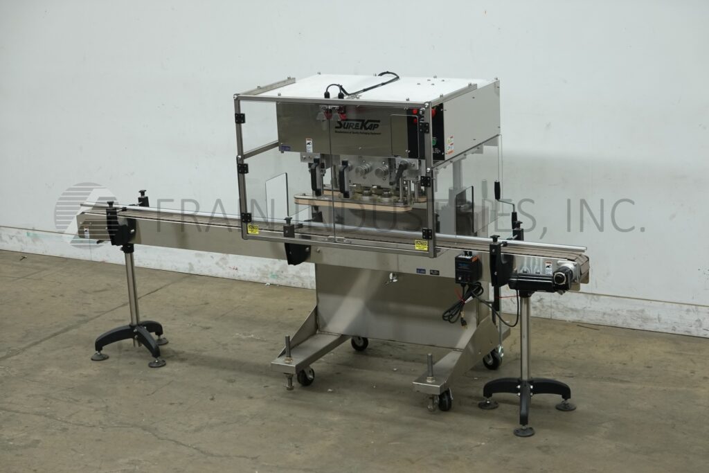 Back to All EquipmentSureKap Model SK600, semi-automatic, inline, stainless steel, 3 station, 6 spindle cap tightening and re-torquing machine with conveyor and is rated from 10 to 90 containers per minute – depending on materials, application and operator dexterity. Cap size range: 8mm to 110mm in Diameter. Equipped with 120" long x 4-1/2" wide stainless steel container conveyor, with 24" long x 1" wide single container gripper belts, (3) hand crank adjustable spindle stations with (2) set of clutches. Control panel with spindle and gripper control dials, start and e-stop buttons. Mounted on heavy duty stainless steel "C" frame with casters and leveling legs.