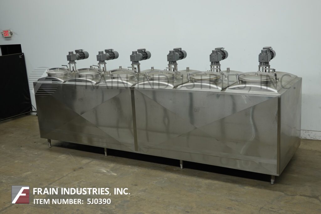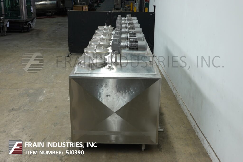 Back to All Equipment(6) chamber, 304 stainless steel, 1,800 gallon total capacity flavor tank, 300 gallons each chamber with inner chamber dimension of 55" long x 31" wide x 43" deep. Equipped with top mounted lift up covers with 17" ID manway and prop style agitation. Slant bottom has 3" OD / 2½"ID tri-clamp style side bottom discharges with 7" floor clearance. Mounted on multiple stainless steel legs.