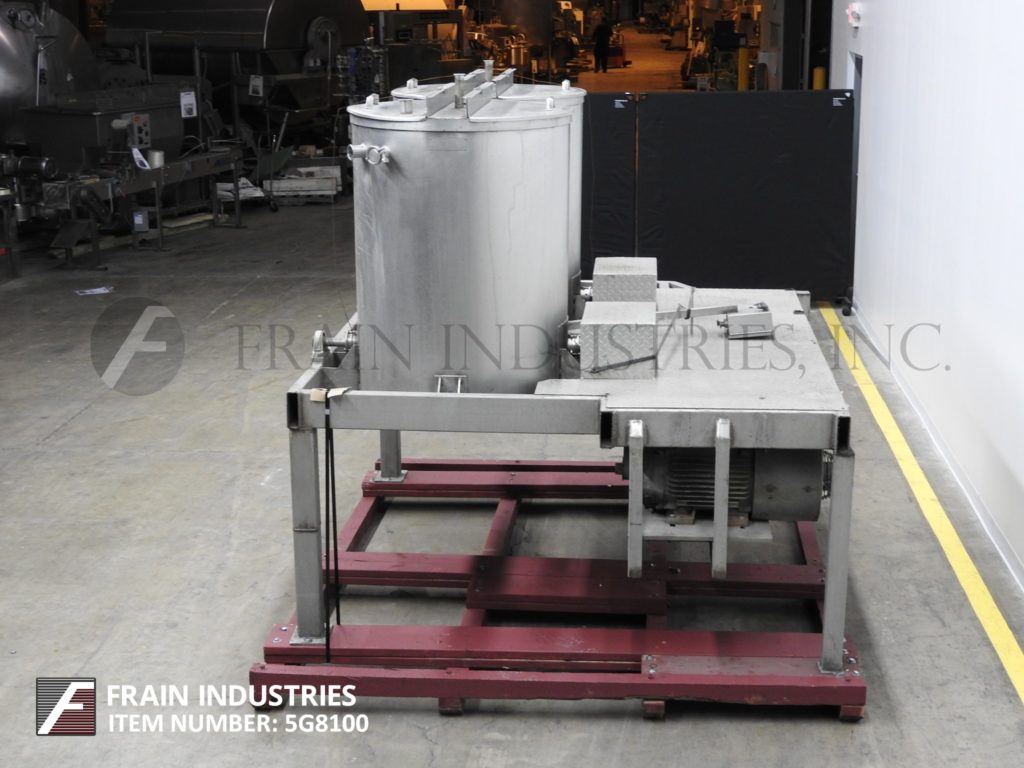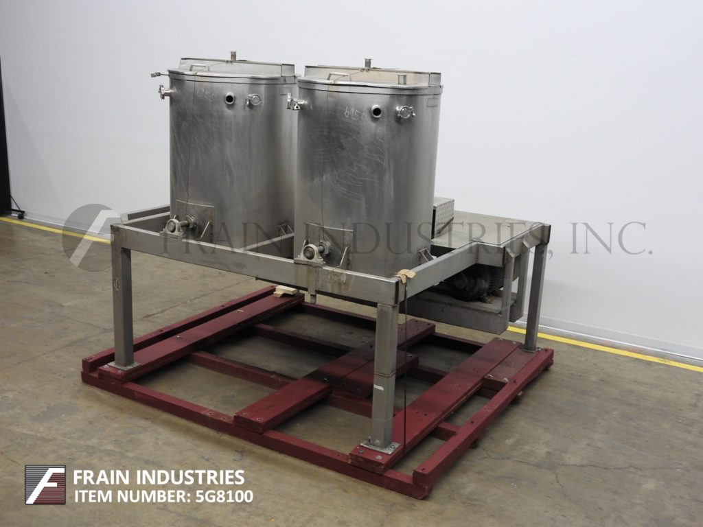 Back to All EquipmentSouth Valley Manufacturing, dual 200 gallon capacity, 316 stainless steel single wall tanks. Vessel dimensions: 35½" diameter x 50" deep with dish style bottom. Equipped with flip up covers and (2) 25 Hp bottom side mounted Dixie mixer agitators. Unit mounted on a (4) leg stainless steel base frame platform with (2) 2½" OD / 2" ID tri-clamp style bottom discharges with 30" ground clearance.