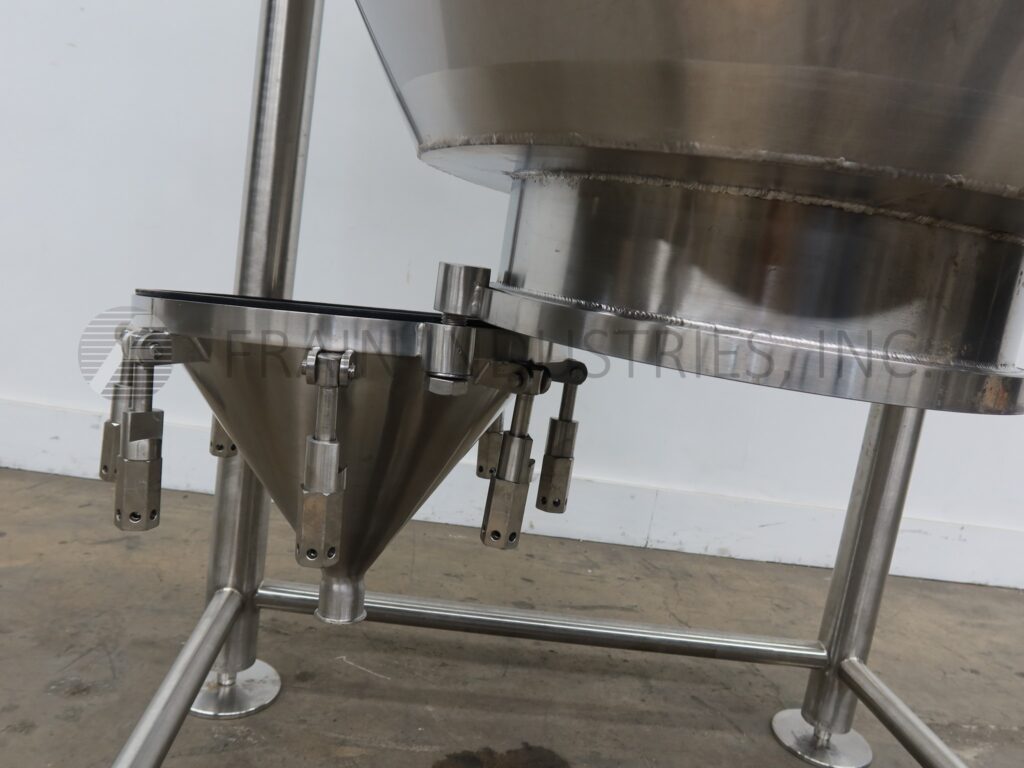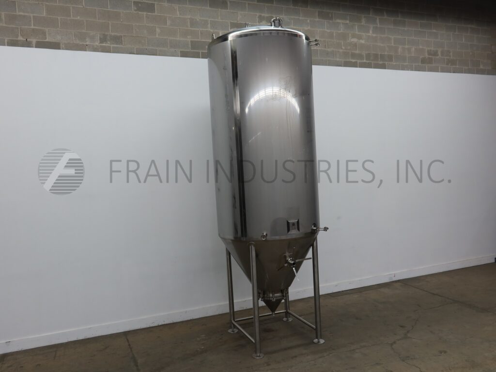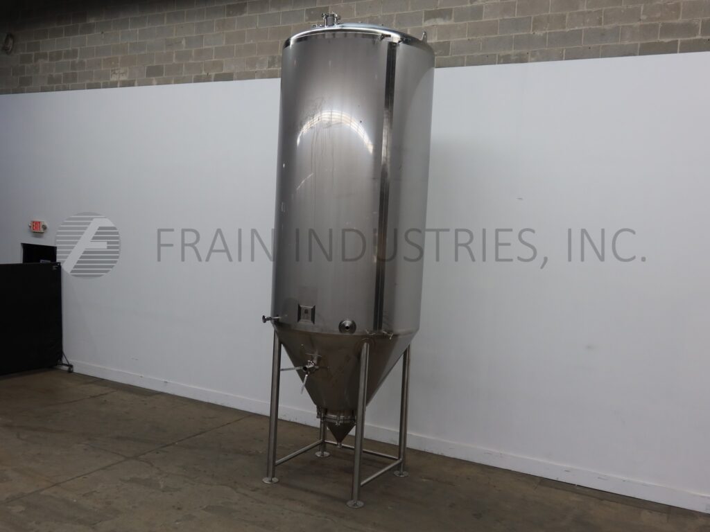 Back to All EquipmentSprinkman, 1,705 gallon, 304 stainless steel, jacketed tank. Vessel Dimensions: 60" diameter x 120" straight wall with a cone bottom. Equipped with a thermowell and bottom cone manway with bolt down cover. 2" Tri-clamp discharge with 14" ground clearance.