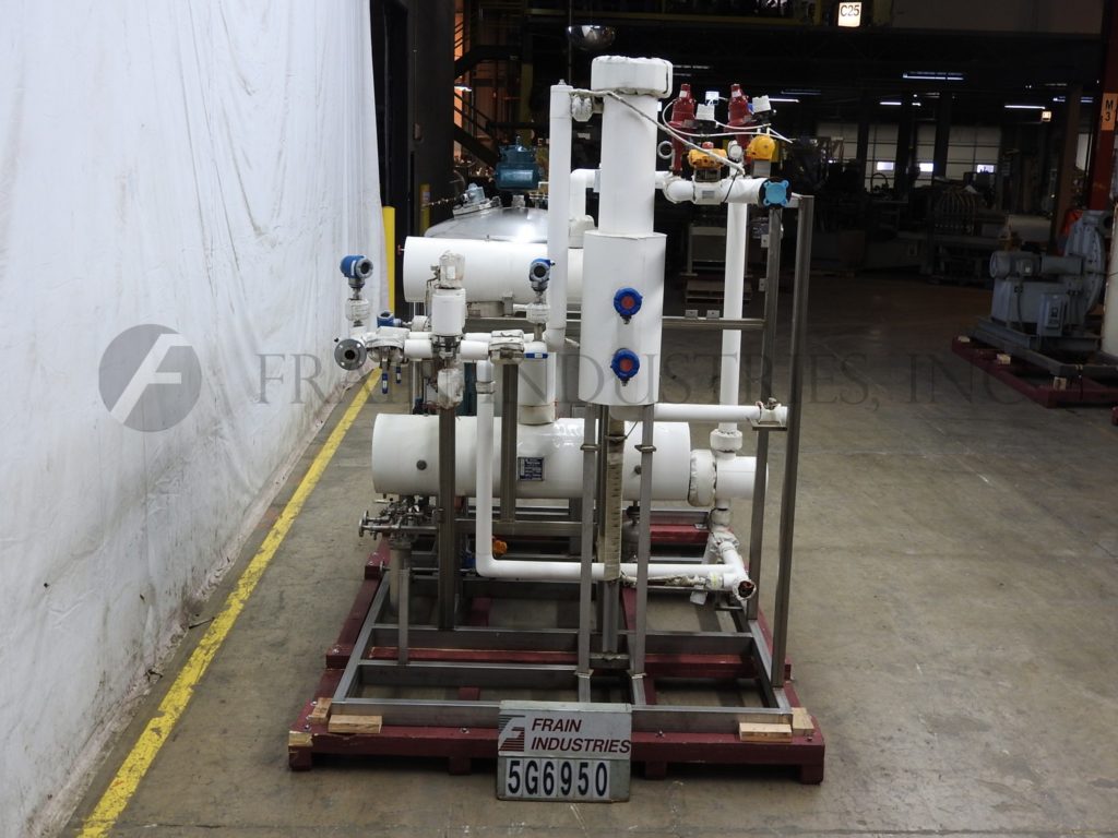 Back to All Equipment300 Gallon, 316 stainless steel, mixing tank and heat exchange system. Vessel dimensions: 44" diameter with a 45" straight wall, dome top and dish bottom with (1) 3½" OD / ¾" ID four-bolt flange discharge. Equipped with a Goulds G&L series transfer pump, heat exchange chamber, (3) Magnetrol Tuffy II float-actuated liquid level switches and (5) digital display pressure transmitters. System mounted on a stainless steel frame.