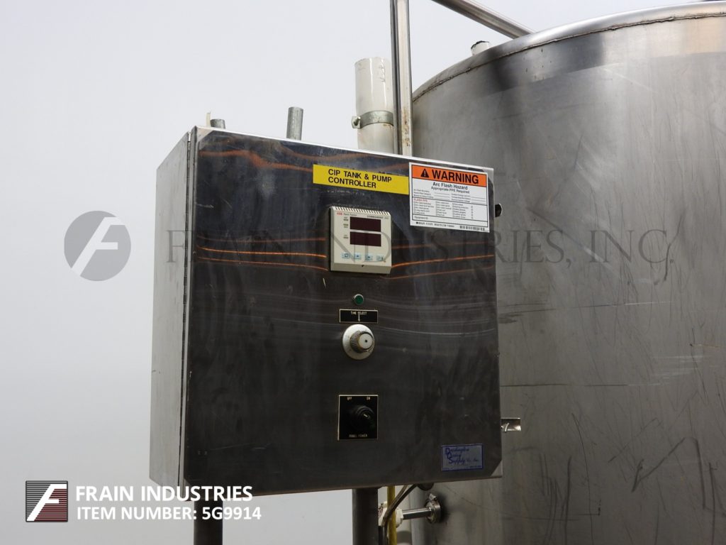 Back to All EquipmentDarlington Dairy Supply, 700 gallon, 304 stainless steel single wall tank. Vessel dimensions: 55" OD x 72" straight wall. Equipped with flat top, 19" man way with flip up cover and level sensors. Dish bottom discharges to a Tri-Clover, Model C216 MD21T-S, centrifugal pump powered by a 7½ hp drive. Control panel with on / off switch, touch pad controller and timer dial. Mounted on a stainless steel base.