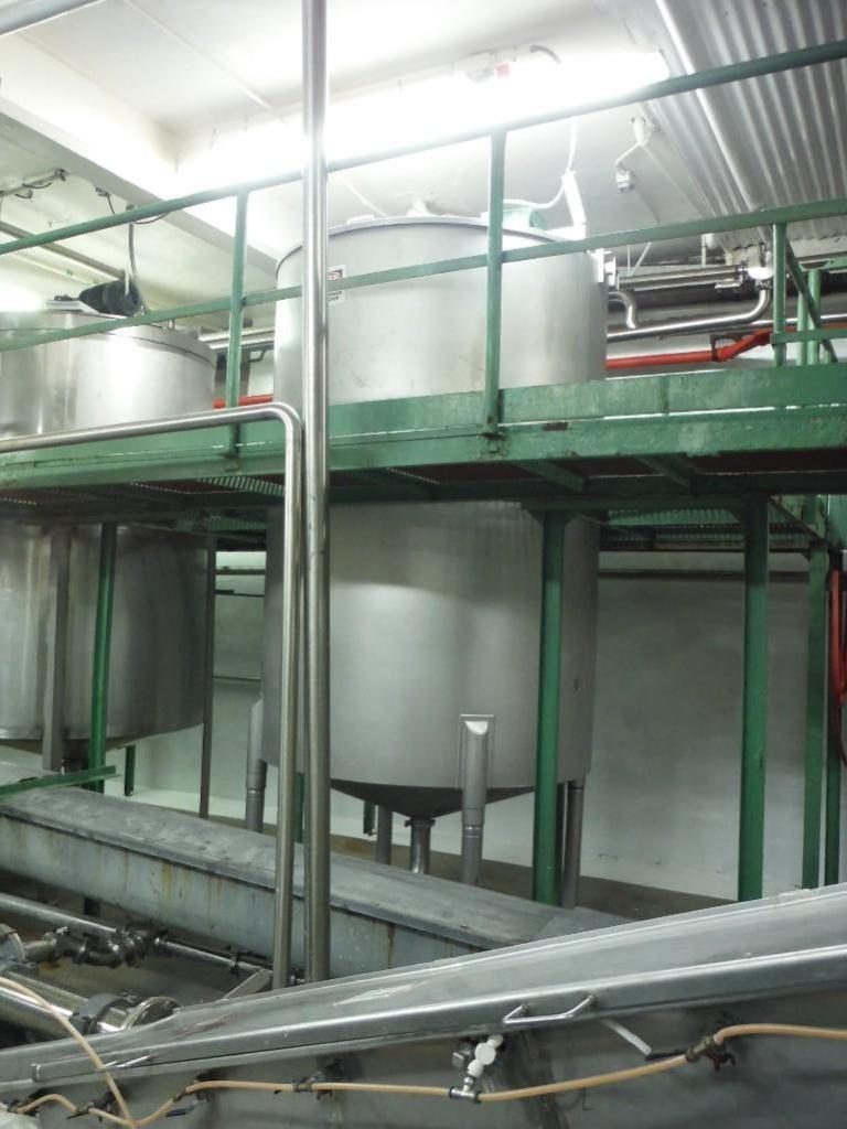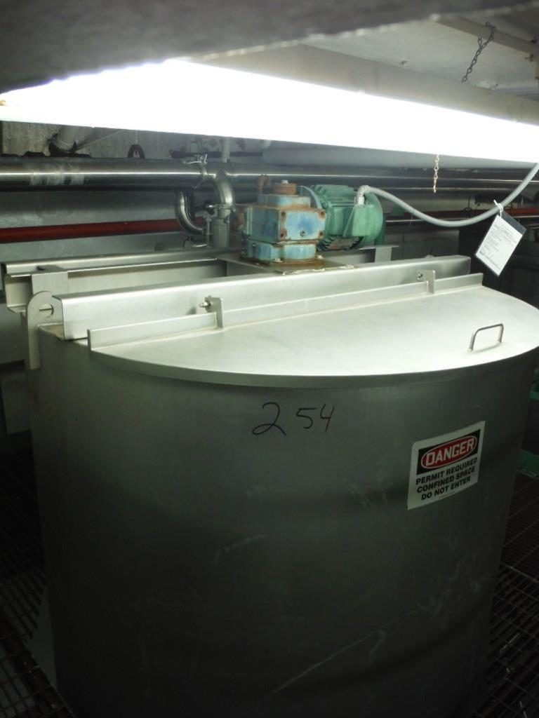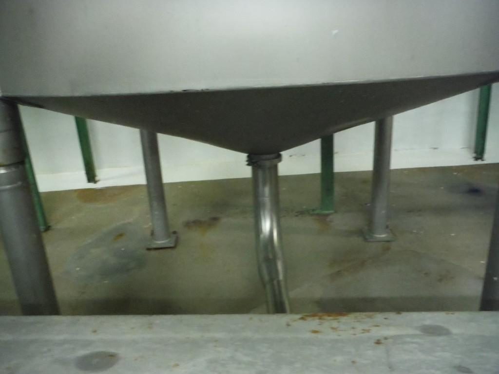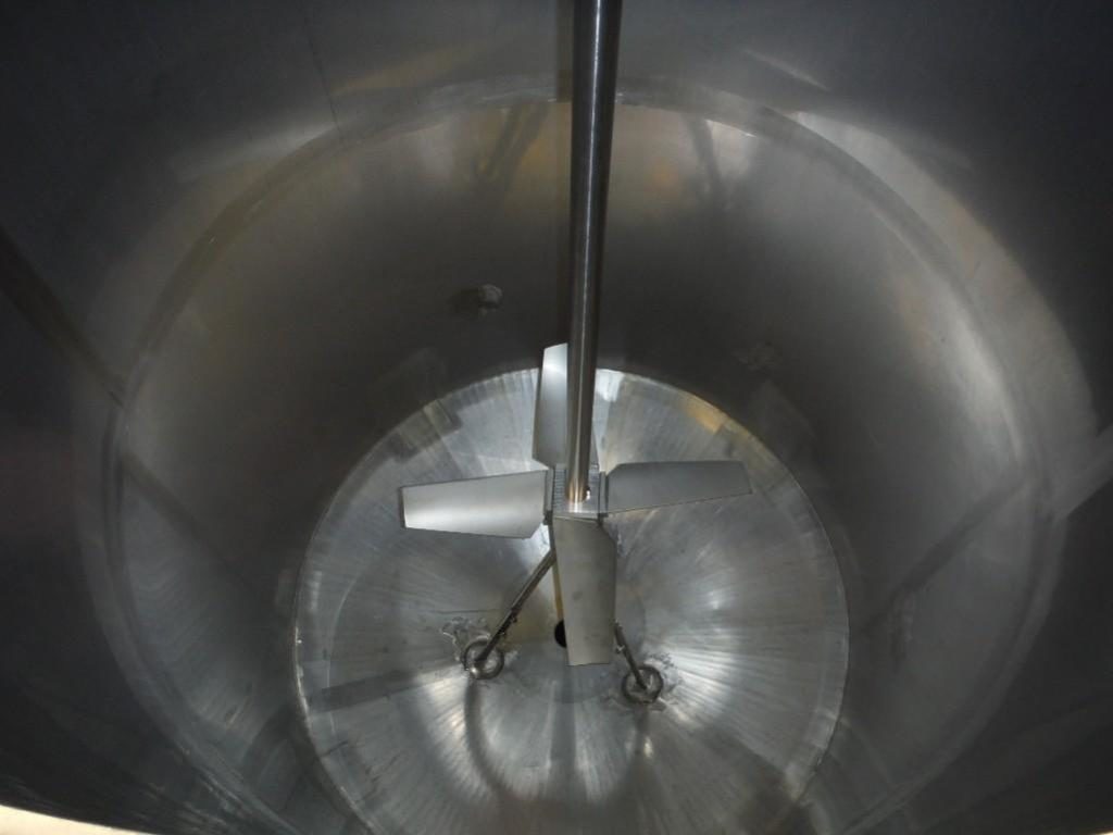 Back to All Equipment1400 gallon capacity, 316 stainless steel single wall tank. Vessel dimensions: 66" diameter x 96" deep with cone style bottom. Equipped with flip up covers, 5 Hp top mounted 30" diameter four-paddle prop agitator. Unit mounted on (4) legs with a 4¾" OD / 4" ID Tri-clamp style bottom discharge with ___" ground clearance.
