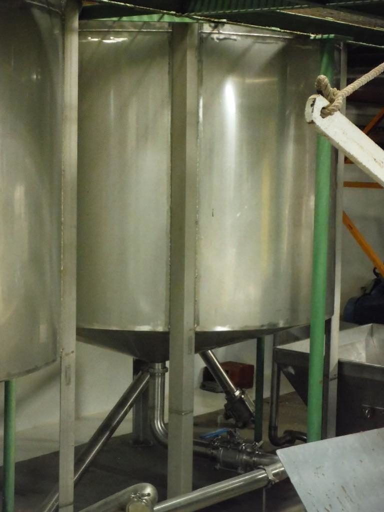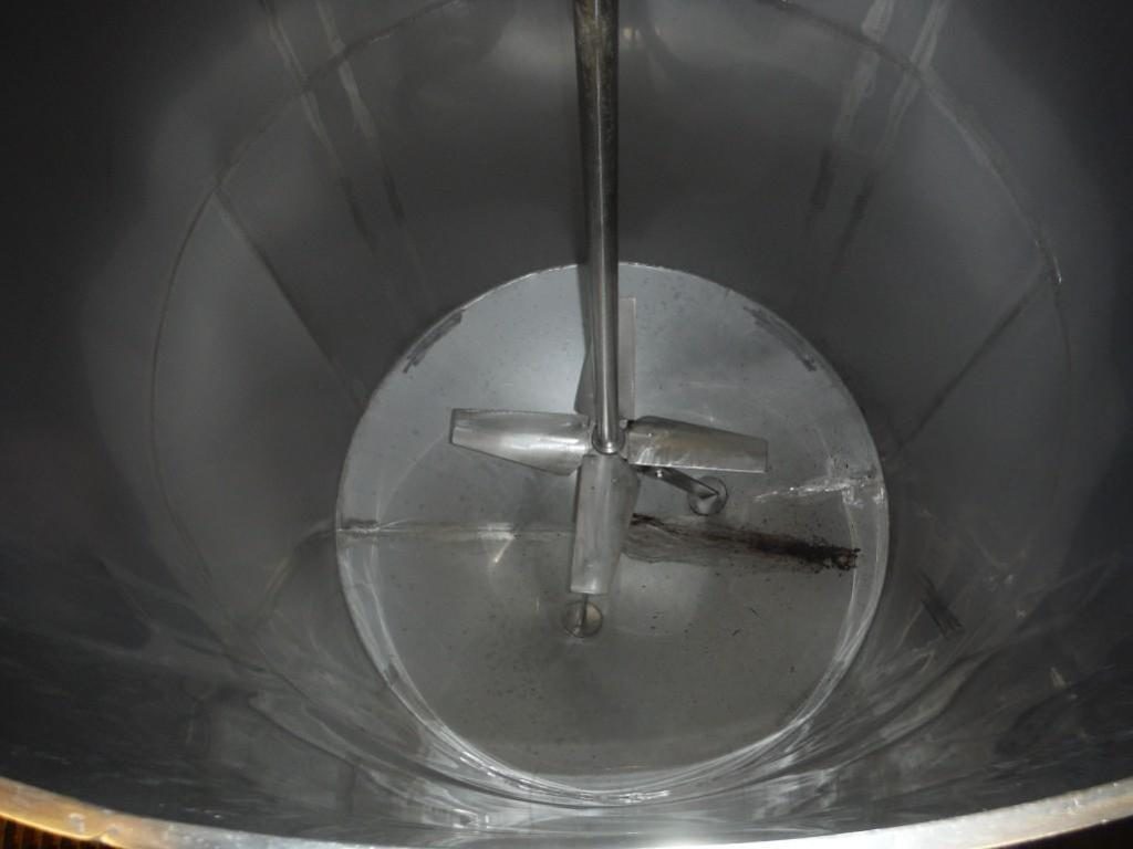 Back to All Equipment1400 gallon capacity, 316 stainless steel single wall tank. Vessel dimensions: 66" diameter x 96" deep with cone style bottom. Equipped with flip up covers, 5 Hp top mounted 30" diameter four-paddle prop agitator. Unit mounted on (4) legs with a 3½" OD / 3" ID Tri-clamp style bottom discharge with ___" ground clearance.