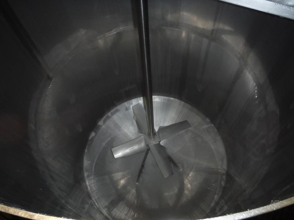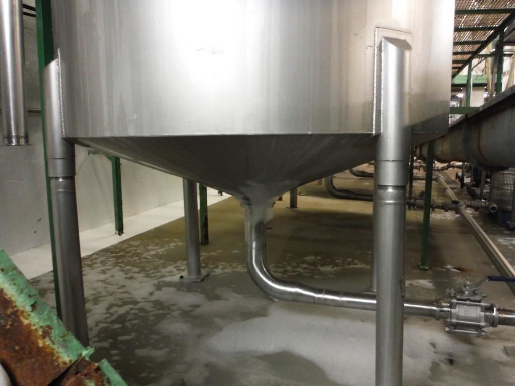 Back to All Equipment1400 gallon capacity, 316 stainless steel single wall tank. Vessel dimensions: 66" diameter x 96" deep with cone style bottom. Equipped with flip up covers, 5 Hp top mounted 30" diameter four-paddle prop agitator. Unit mounted on (4) legs with a 4¾" OD / 4" ID Tri-clamp style bottom discharge with ___" ground clearance.