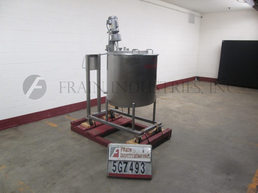 Back to All Equipment75 gallon capacity, 304 stainless steel single wall tank. Vessel dimensions: 32" diameter x 29" deep with slant style bottom. Equipped with flip up covers, and a .33 Hp side mounted prop agitator. Unit mounted on a 48" x 24" stainless steel base with casters and a 2½" OD / 2" ID Tri-clamp style bottom discharge with 20" ground clearance.